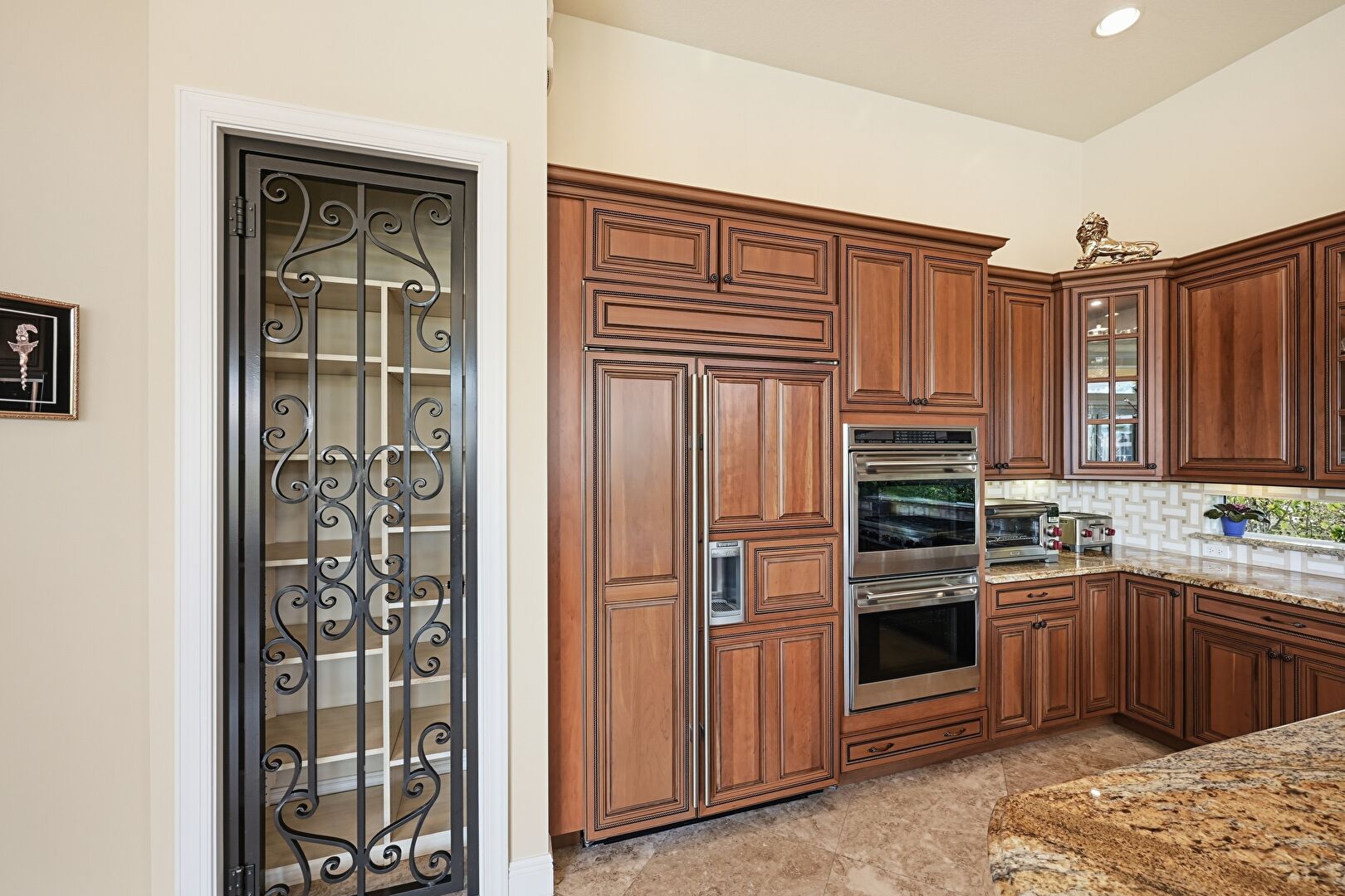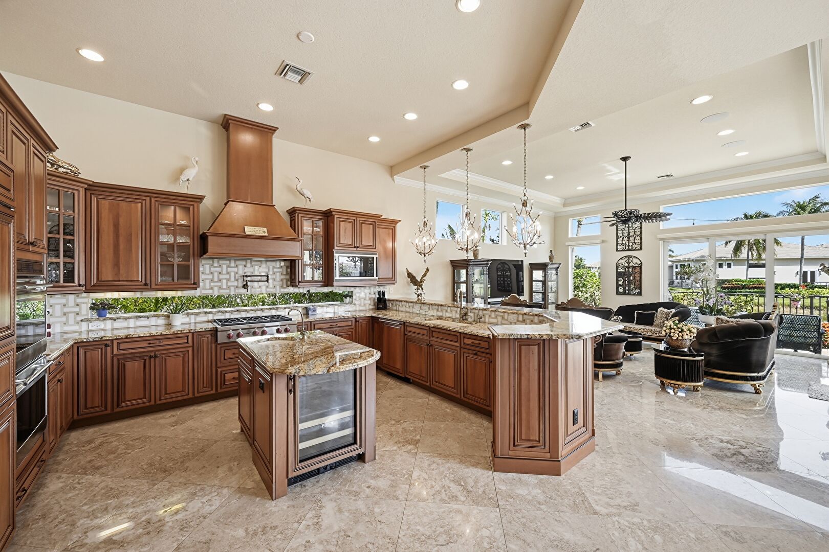 Arched Walkways, Baseboards Wall, Crown Molding, Crown Molding Cabinets, Double Oven, Drywall, Glass Insert Cabinets, High Ceiling, Kitchen Bar, Kitchen Island, Kitchen Peninsula, Marble Finish Floor, Medium Brown Cabinets, Natural Light, Notable Chandelier, Opens To Living Area, Pendant Lighting, Pot Filler, Raised Cabinets, Recessed Lighting, Stone Countertops, Tile Floor, Toaster, Tray Ceiling, U Shaped Kitchen, Vent, Wine Cooler, Glass Insert Cabinets, Natural Light, Pendant Lighting, Pot Filler, Recessed Lighting, Stone Countertops, Tray Ceiling, Vent