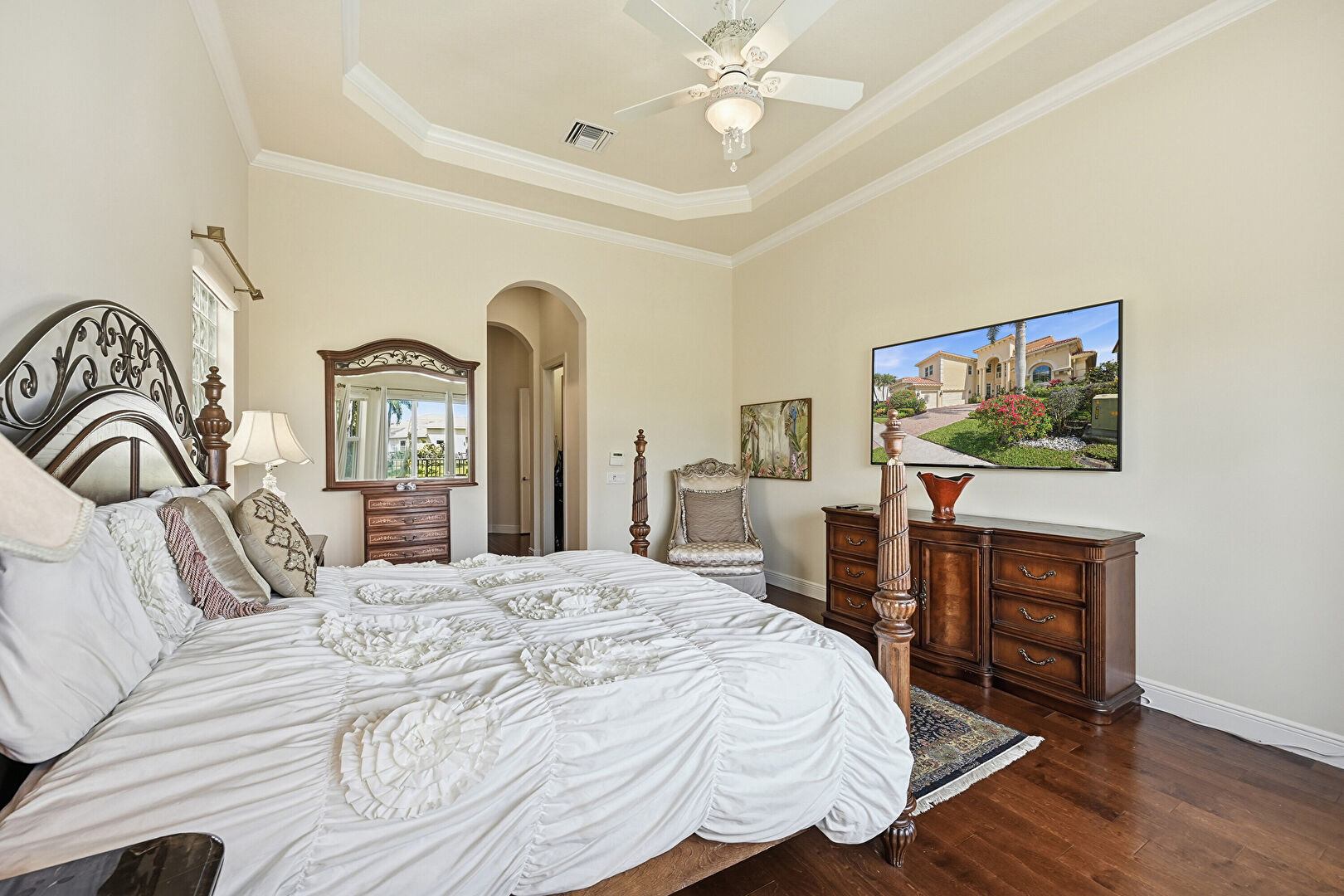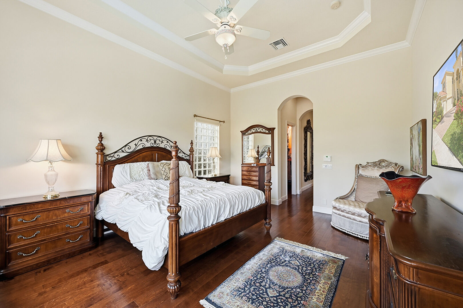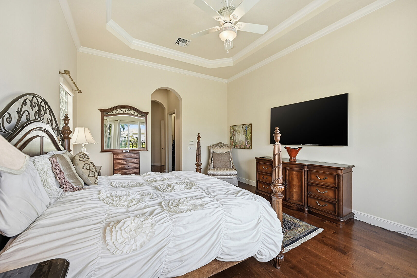 Arched Walkways, Baseboards Wall, Ceiling Fan, Crown Molding, Drywall, High Ceiling, Natural Light, Tray Ceiling, Vent, Wood Finish Floor, Arched Walkways, Drywall, Natural Light, Vent