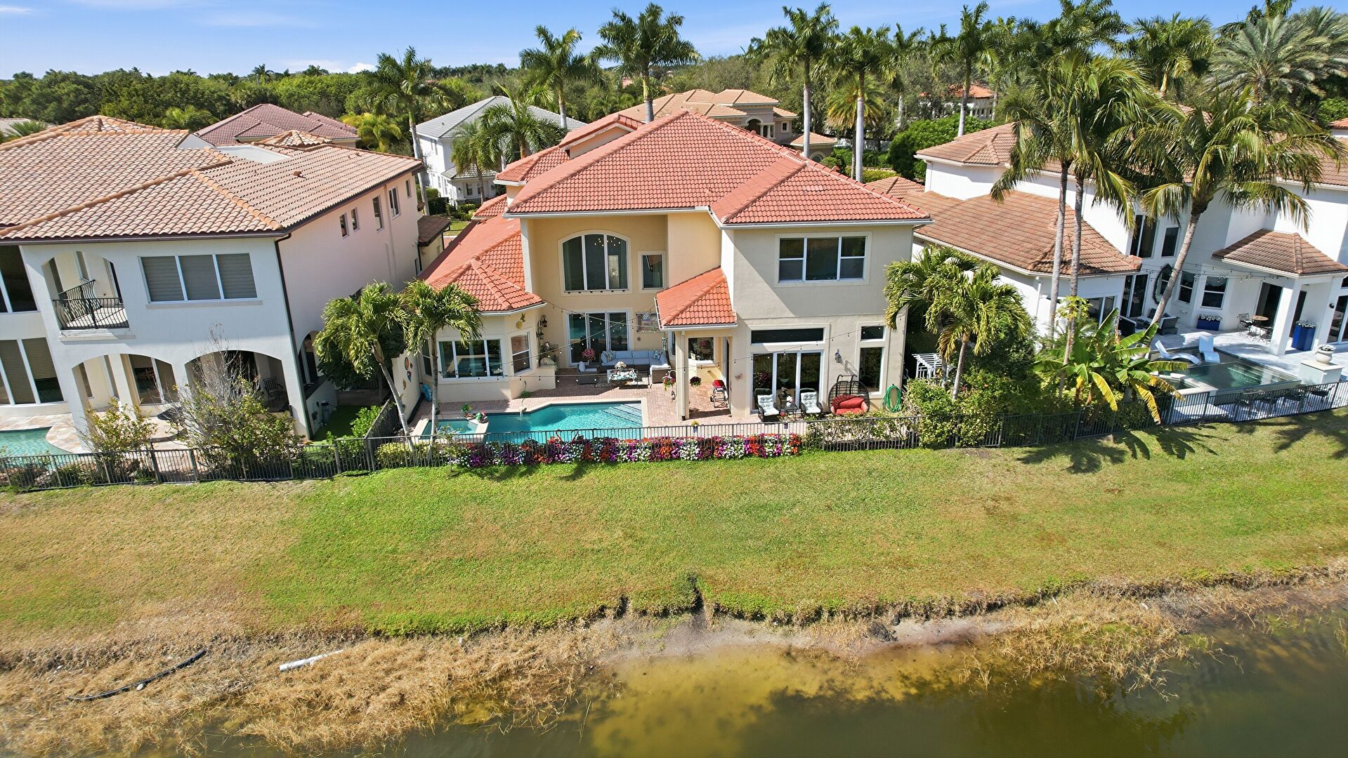 Downspout, Fence, Fire Pit, Grill, Gutters, Hot Tub, Outdoor Kitchen, Outdoor Living Space, Patio, Pool, Pool Hot Tub Combo, Stucco Siding, Tile Roof, Water View, Waterfront, Fence, Grill, Patio, Pool