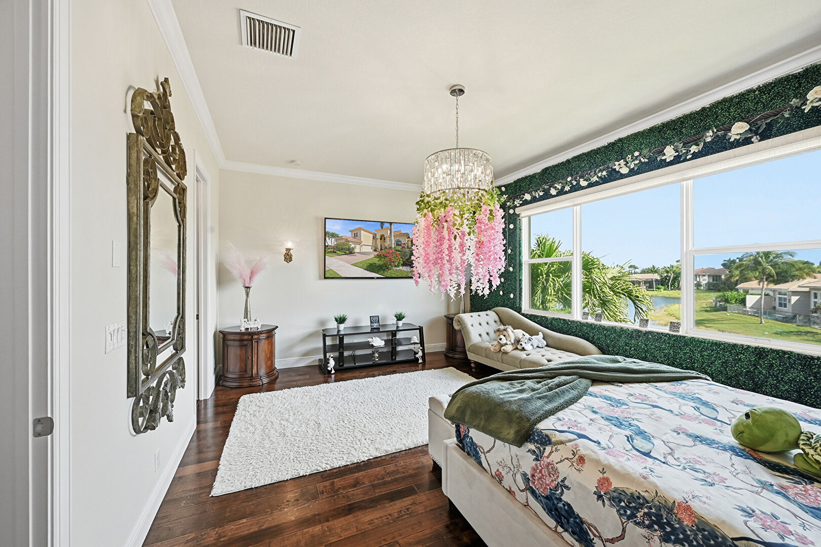 Baseboards Wall, Crown Molding, Drywall, Natural Light, Notable Chandelier, Vent, Water View, Waterfront, Wood Finish Floor, Crown Molding, Waterfront
