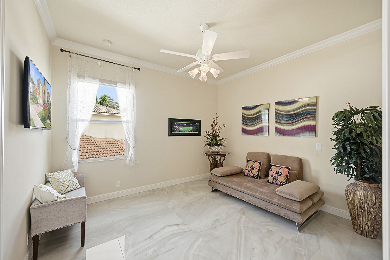 Baseboards Wall, Crown Molding, Drywall, Marble Finish Floor, Natural Light, Notable Chandelier, Office Area, Wallpaper Wall, Marble Finish Floor, Vent