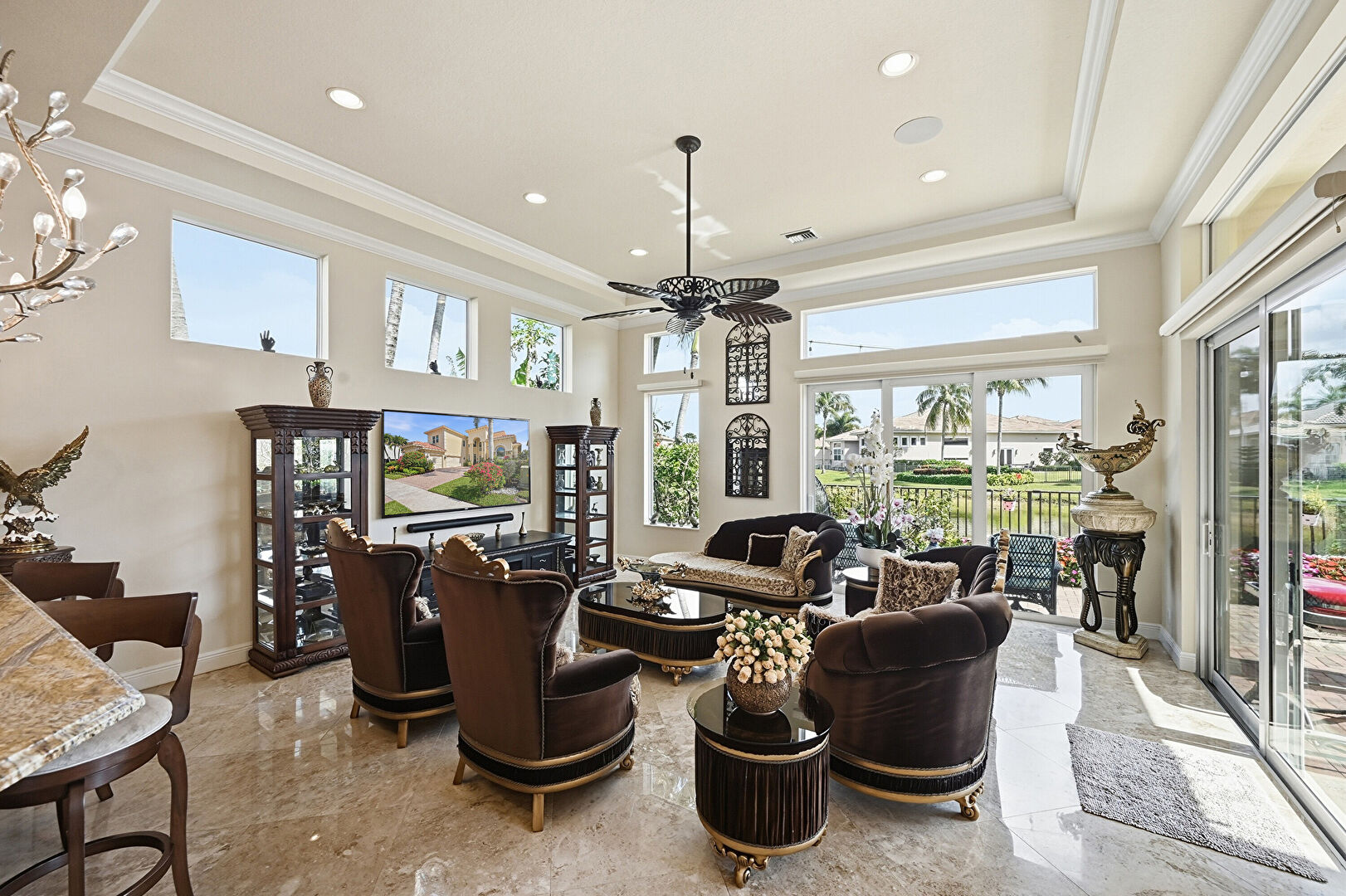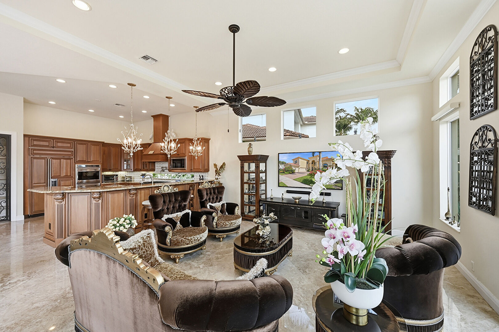 Baseboards Wall, Ceiling Fan, Crown Molding, Double Oven, Drywall, High Ceiling, Marble Finish Floor, Natural Light, Notable Chandelier, Recessed Lighting, Toaster, Tray Ceiling, Vent, Arched Walkways, High Ceiling, Recessed Lighting, U Shaped Kitchen