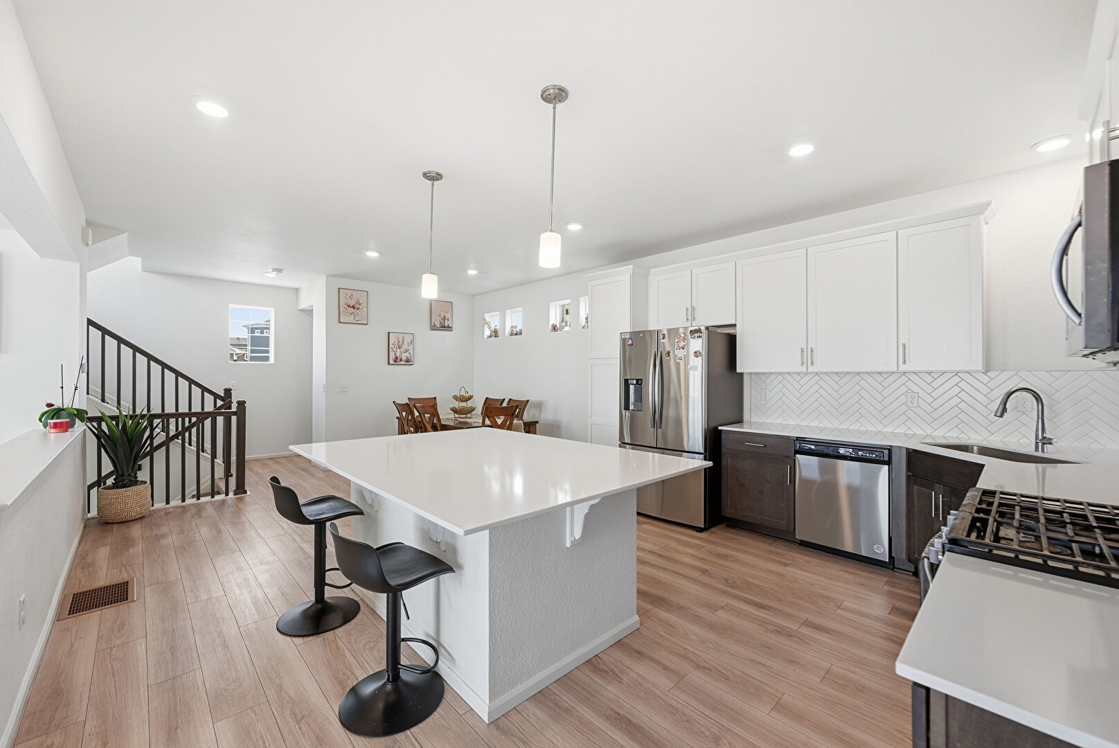 Baseboards Wall, Crown Molding Cabinets, Dark Brown Cabinets, Drywall, Kitchen Bar, Kitchen Island, L Shaped Kitchen, Natural Light, Opens To Living Area, Pendant Lighting, Recessed Lighting, Shaker Cabinets, Stone Countertops, Vent, Wood Finish Floor, Crown Molding Cabinets, Dark Brown Cabinets, Drywall, Natural Light, Shaker Cabinets, Stone Countertops