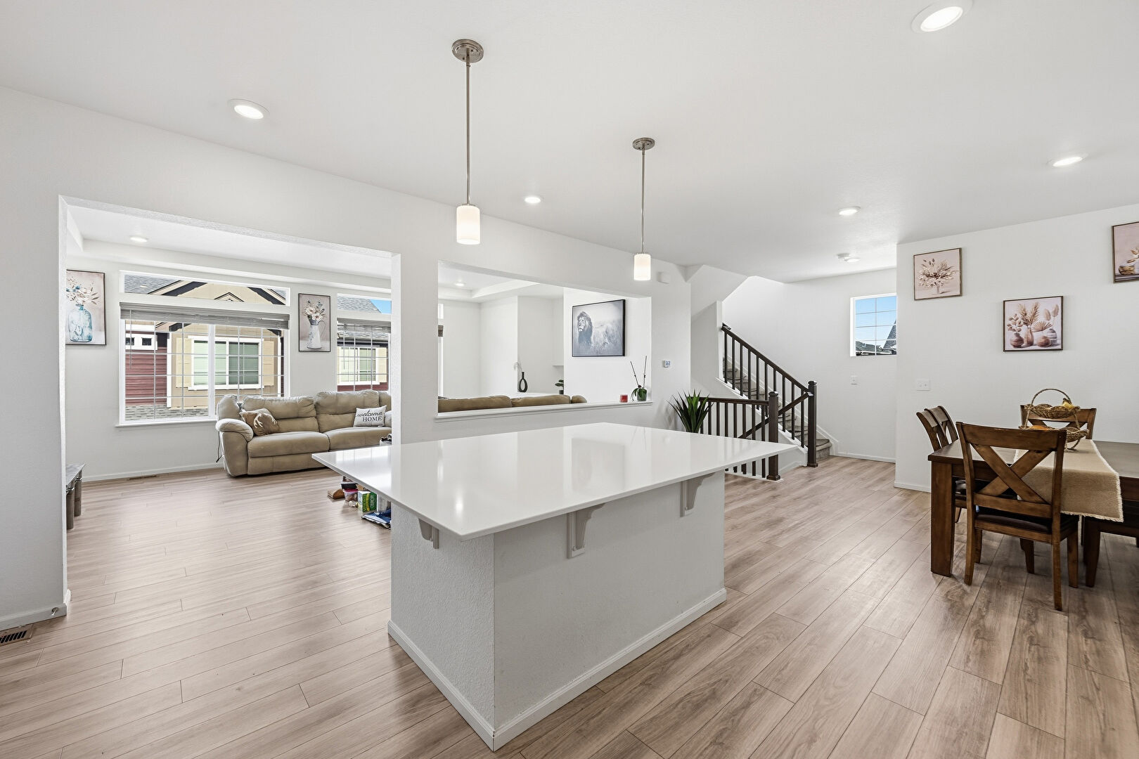 Baseboards Wall, Drywall, L Shaped Kitchen, Natural Light, Recessed Lighting, Wood Finish Floor, Drywall, Natural Light