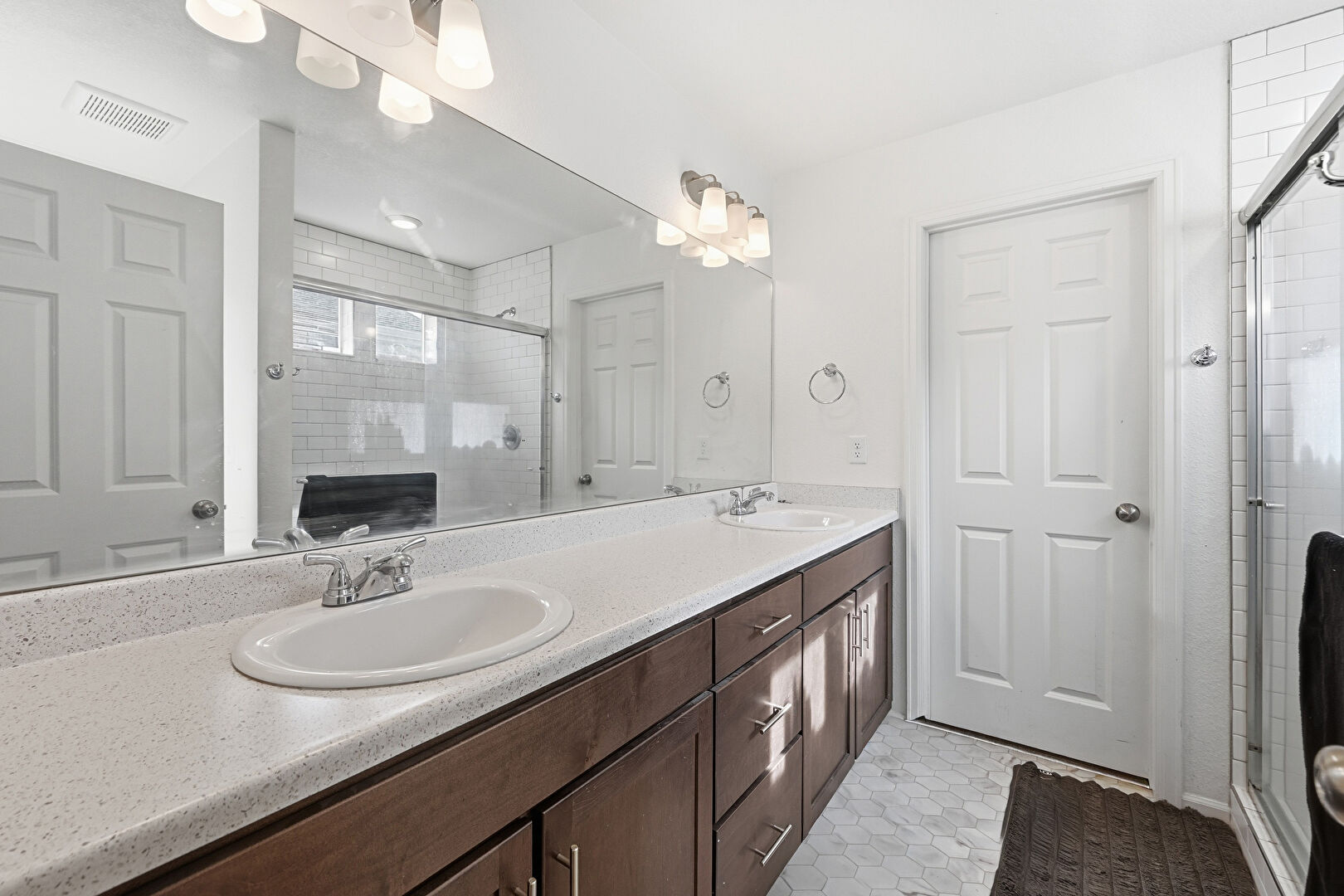 Double Vanity, Drywall, Full Bathroom, Natural Light, Tile Floor, Vent, Full Bathroom, Vanity