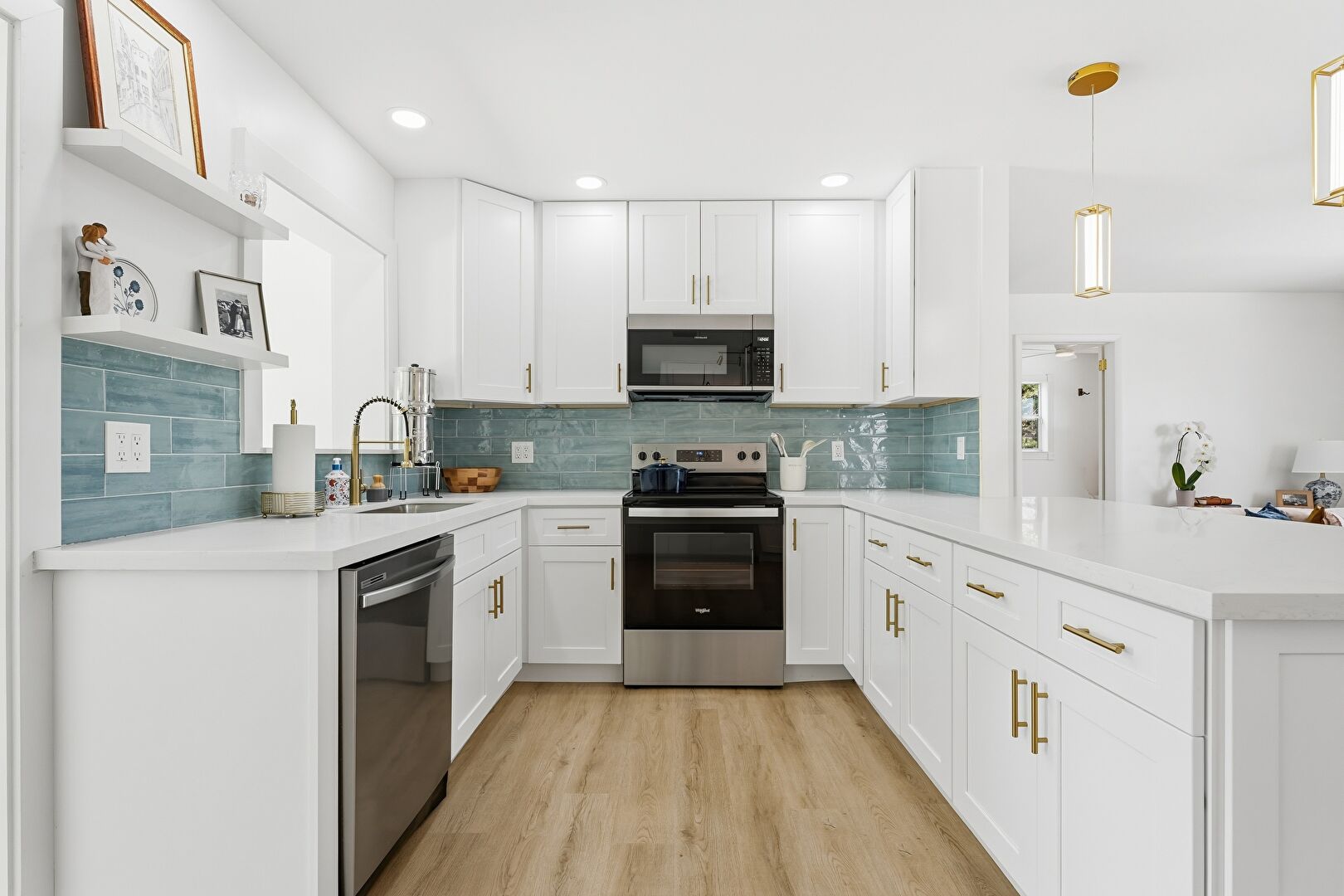 Baseboards Wall, Drywall, Kitchen Bar, Kitchen Peninsula, Natural Light, Open Shelves, Pendant Lighting, Recessed Lighting, Shaker Cabinets, Stone Countertops, Track Lighting, U Shaped Kitchen, Vent, Wood Finish Floor, Drywall, Pass Through Window, Stone Countertops, U Shaped Kitchen