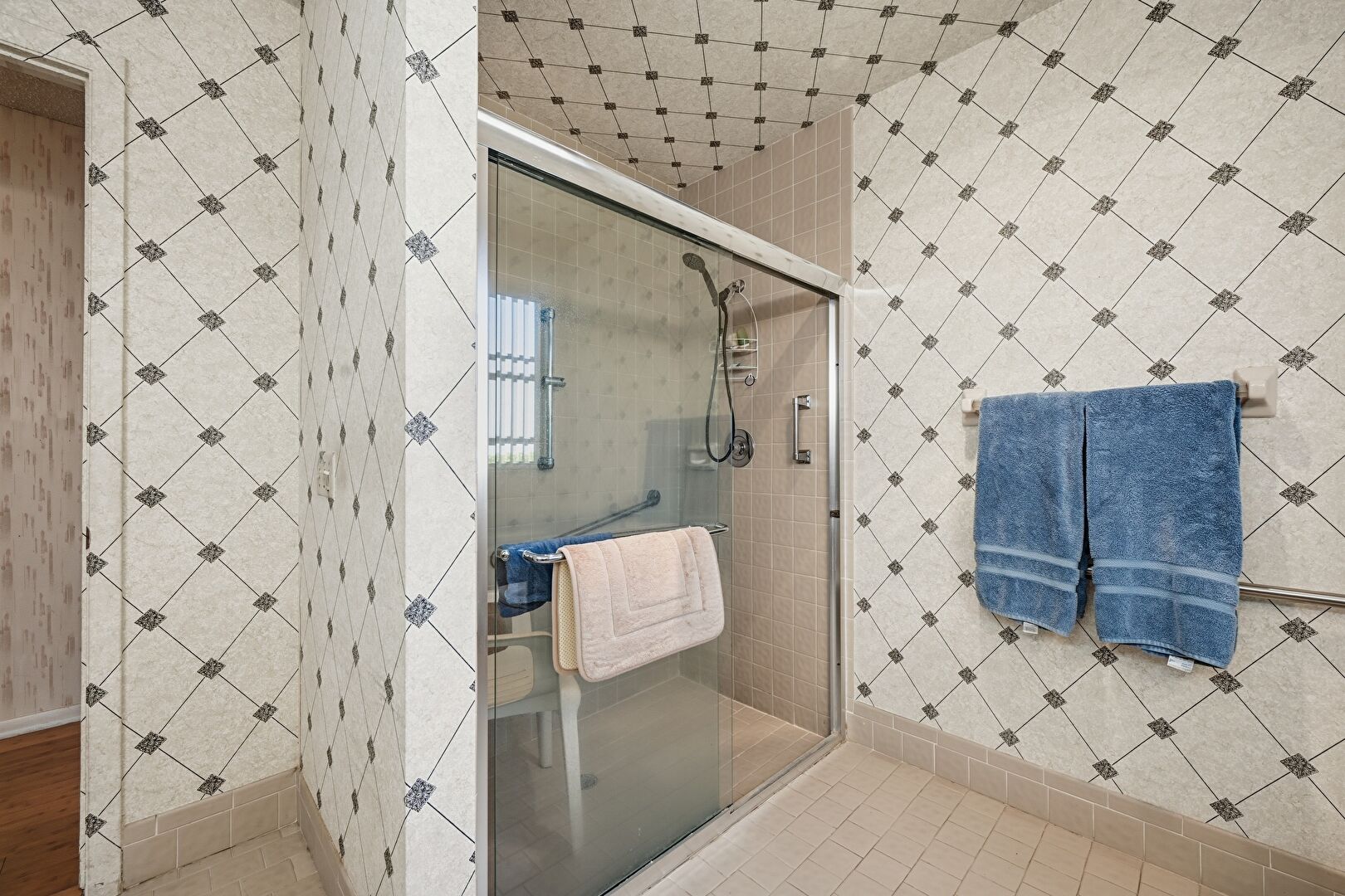 Combined Bath Shower, Natural Light, Tile Floor, Vanity, Wallpaper Wall, Full Bathroom