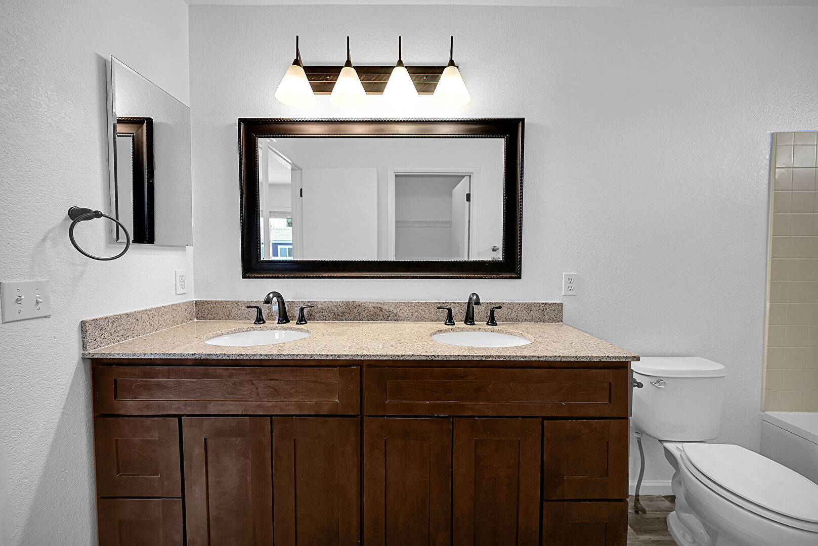 Baseboards Wall, Ceiling Fan, Combined Bath Shower, Double Vanity, Drywall, Full Bathroom, Natural Light, Textured Ceiling, Textured Wall, Wood Finish Floor, Double Vanity, Textured Wall, Vent