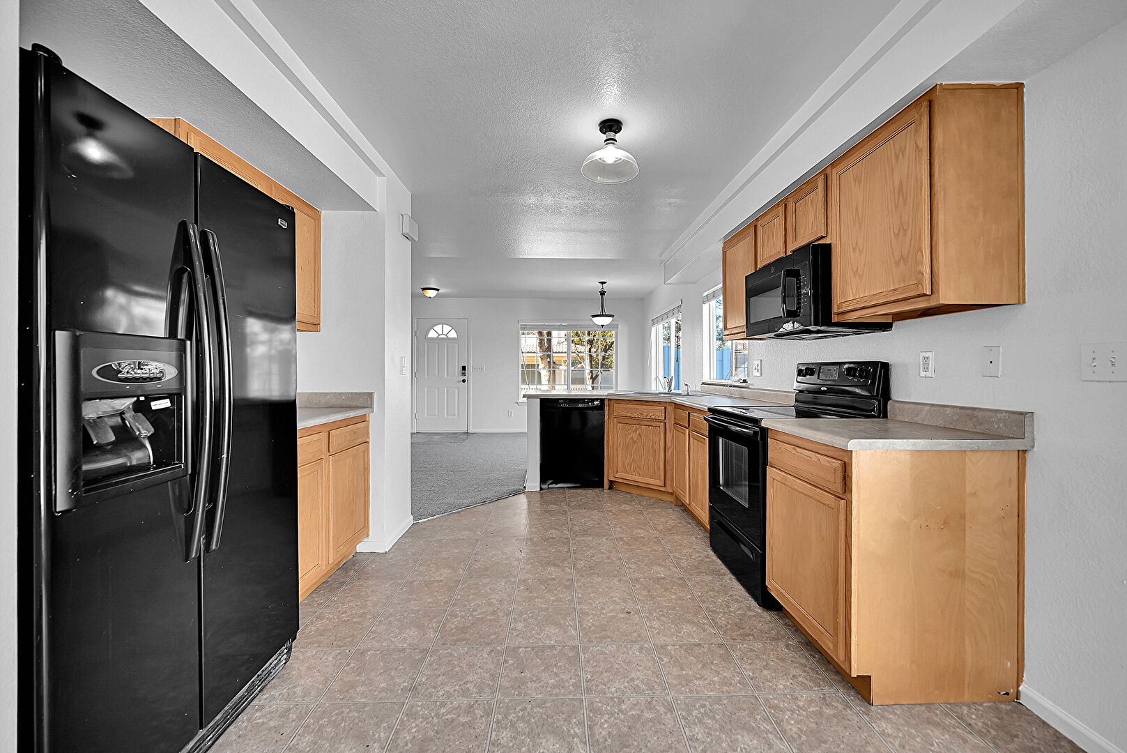 Baseboards Wall, Drywall, Kitchen Peninsula, Medium Brown Cabinets, Natural Light, Notable Chandelier, Pendant Lighting, Shaker Cabinets, Tray Ceiling, Vinyl Floor, Natural Light, Vent