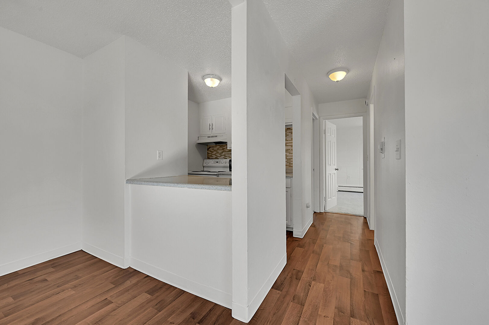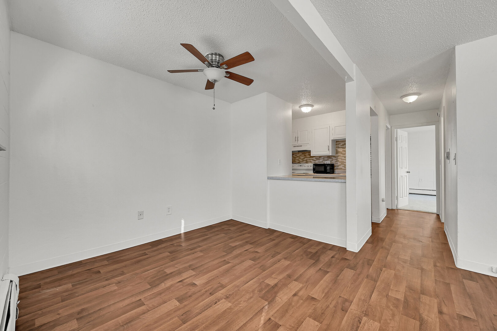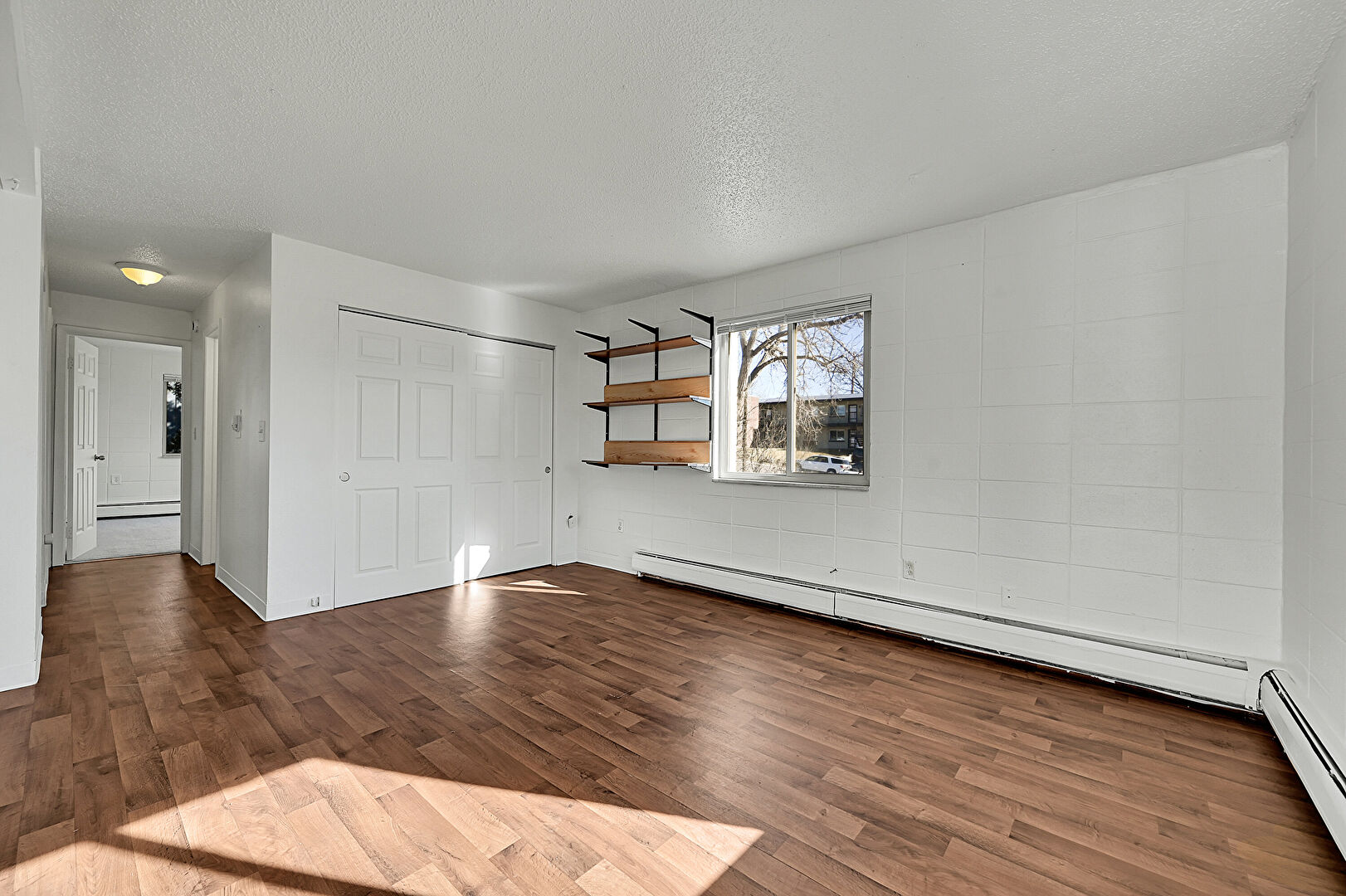 Baseboards Wall, Drywall, Textured Ceiling, Wood Finish Floor, Baseboard Radiator