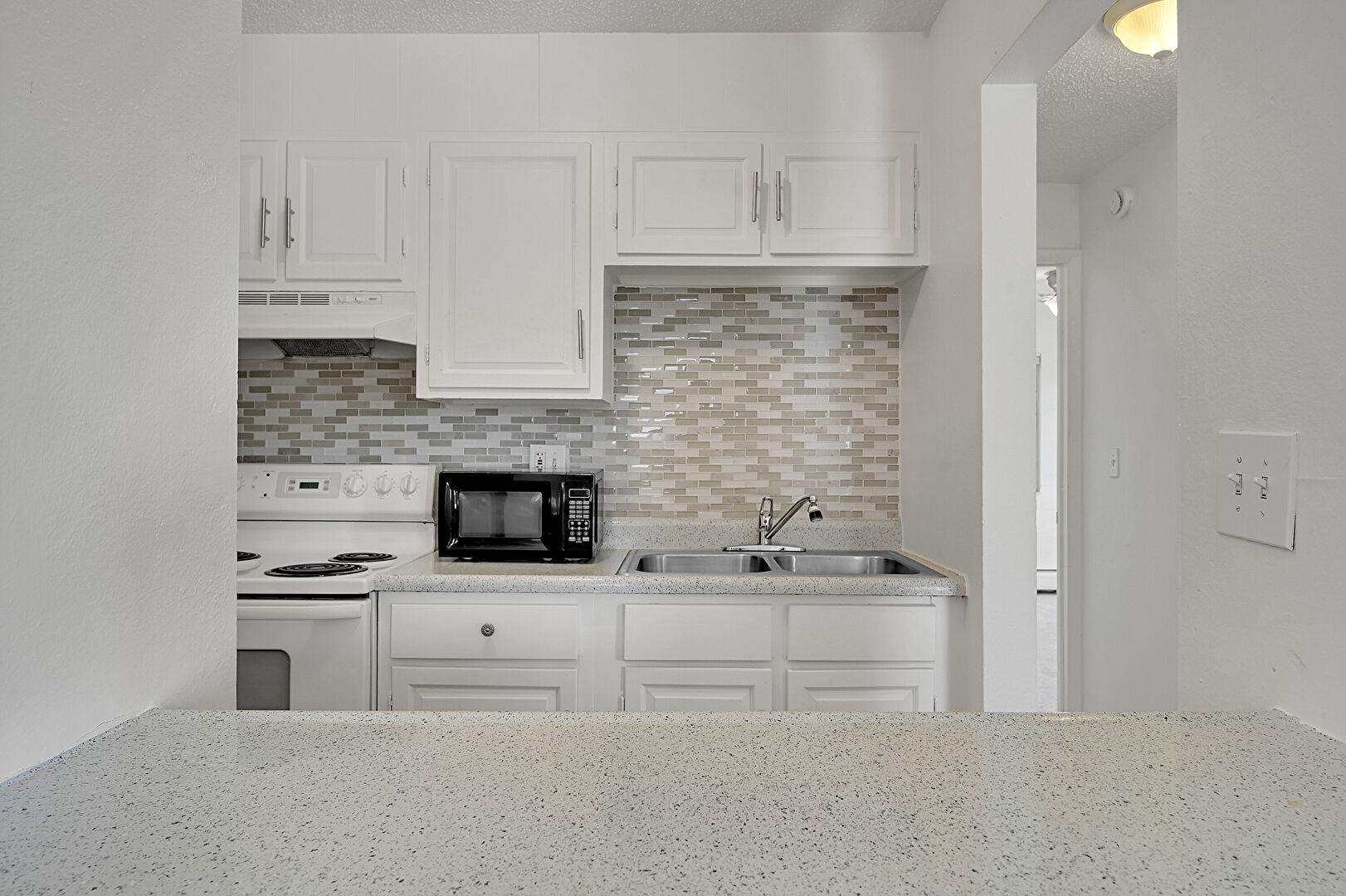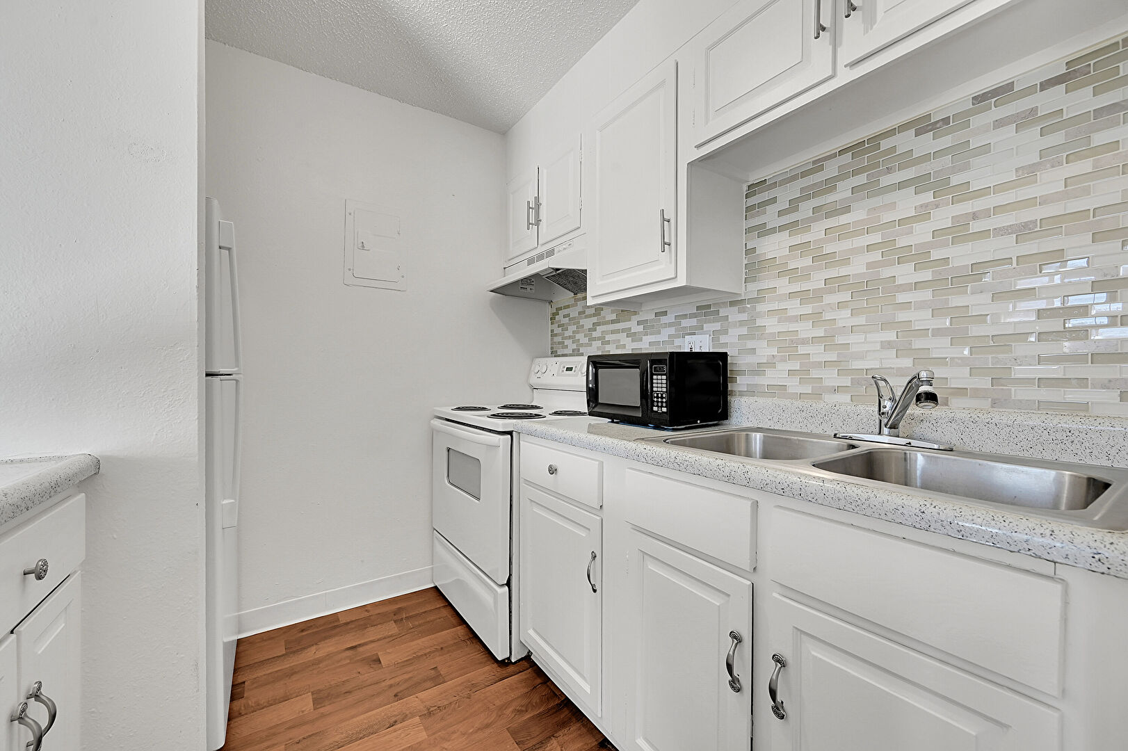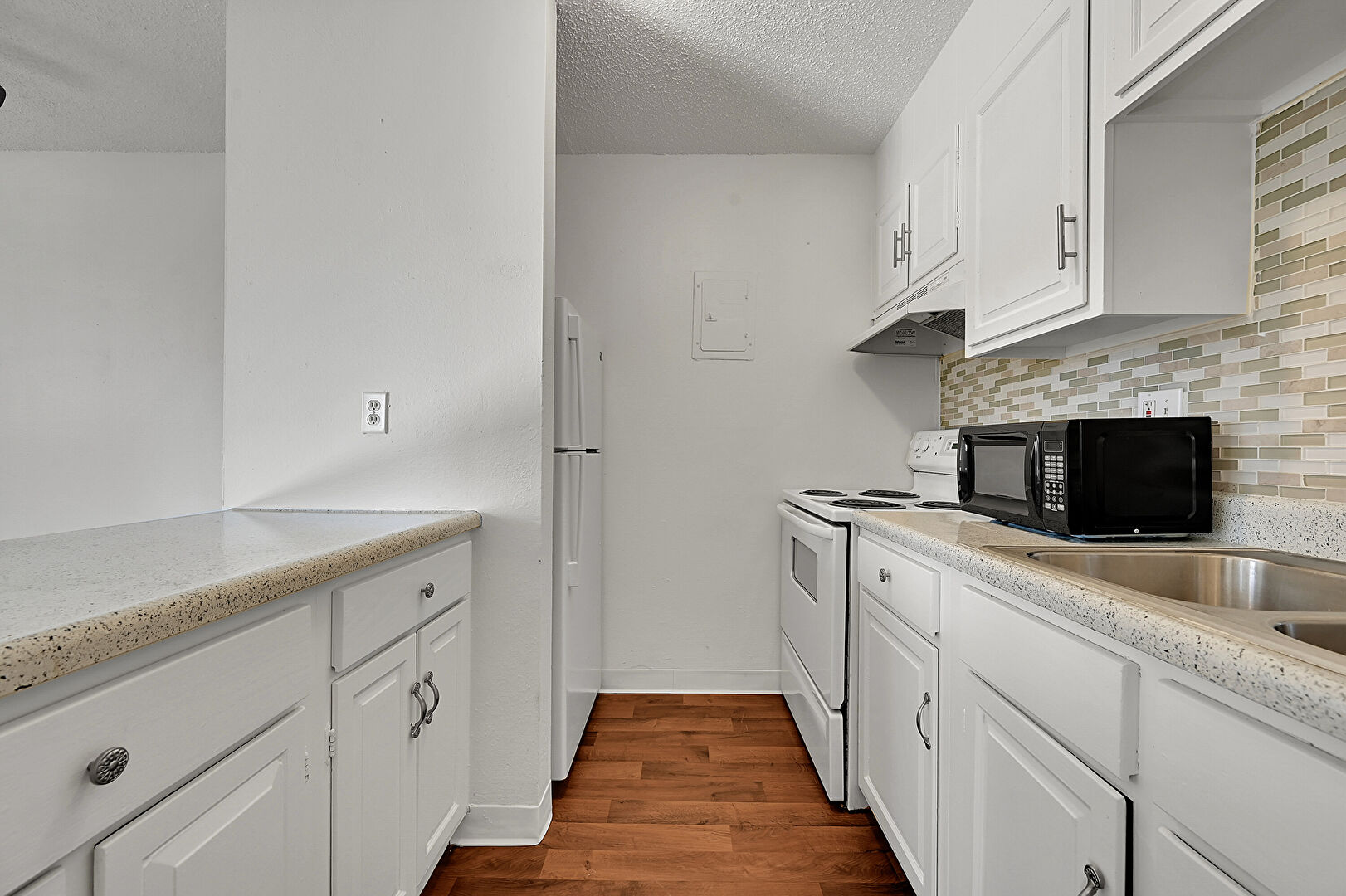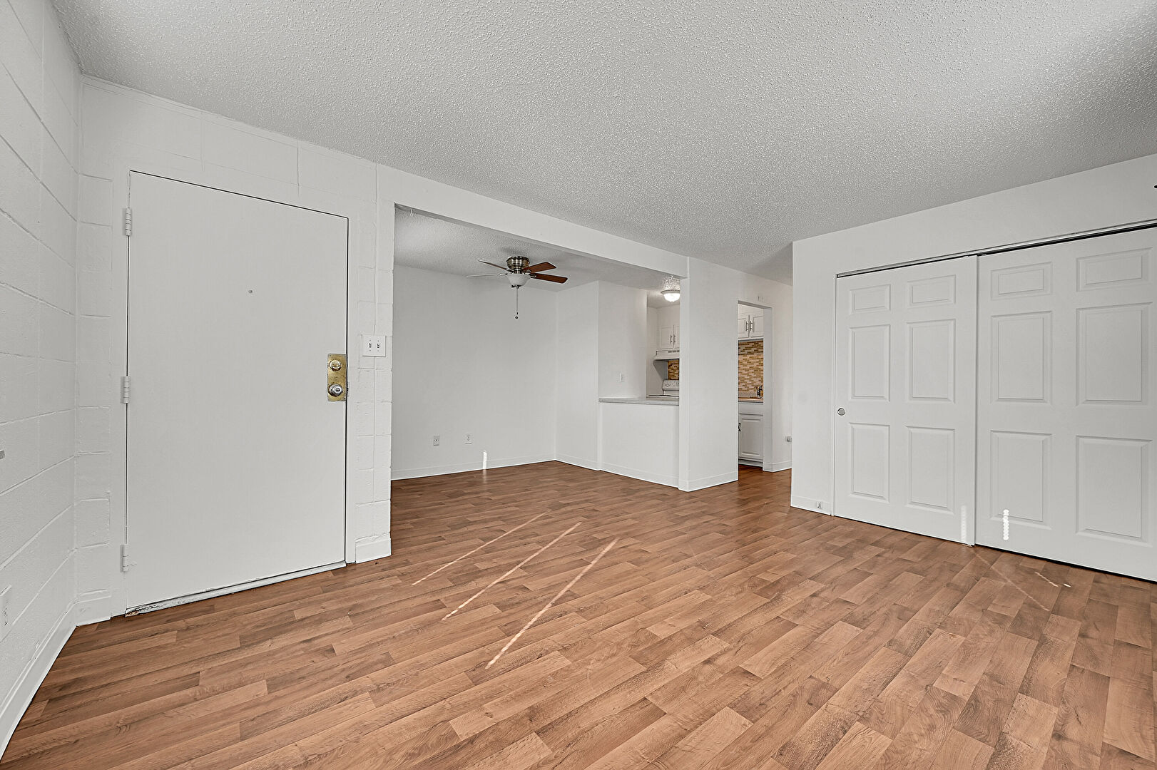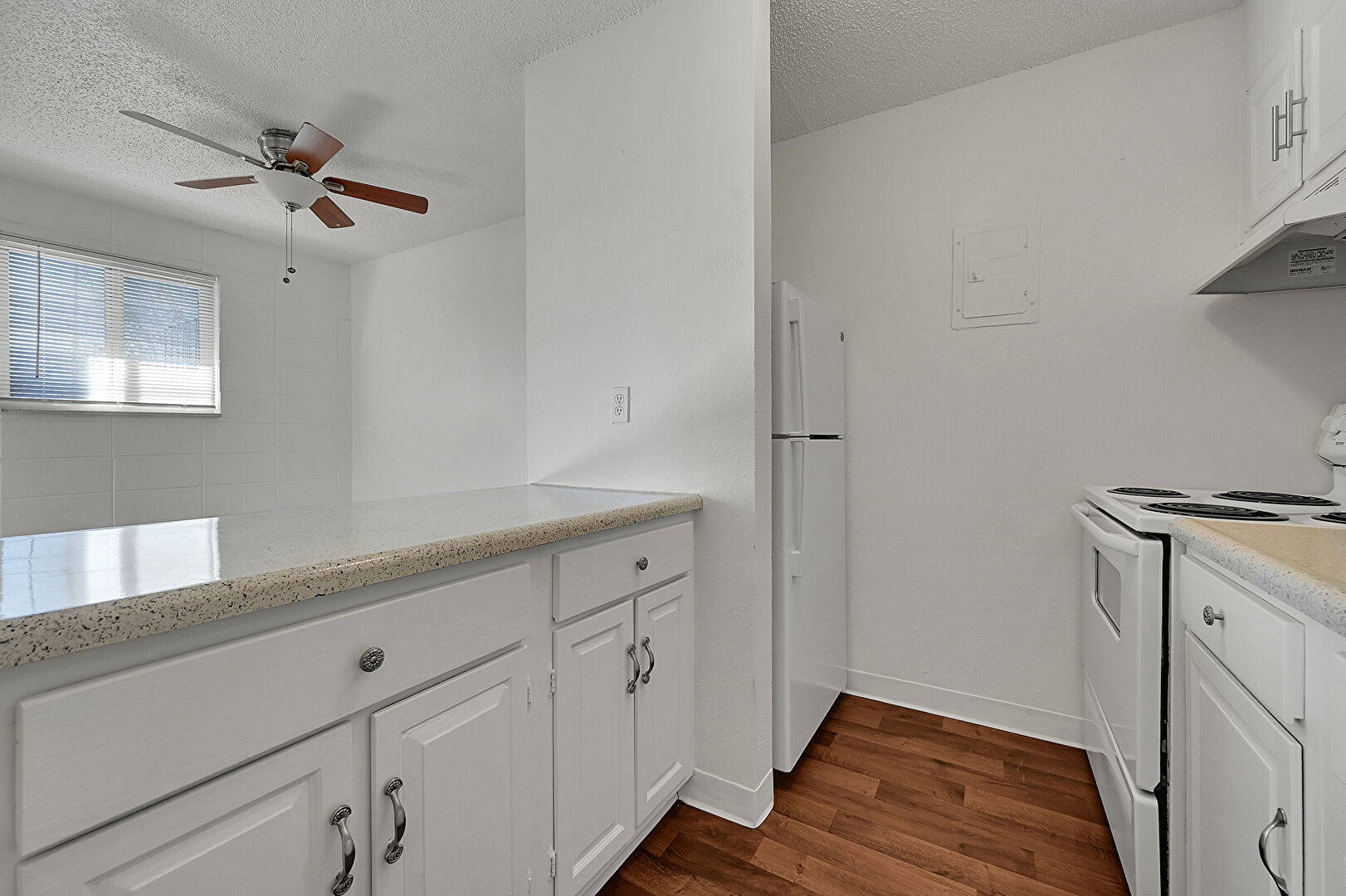 Baseboards Wall, Ceiling Fan, Drywall, Electric Panel, Natural Light, Raised Cabinets, Stone Countertops, Textured Ceiling, Visible Hinge Cabinets, Wood Finish Floor, Baseboards Wall, Stone Countertops, Textured Ceiling