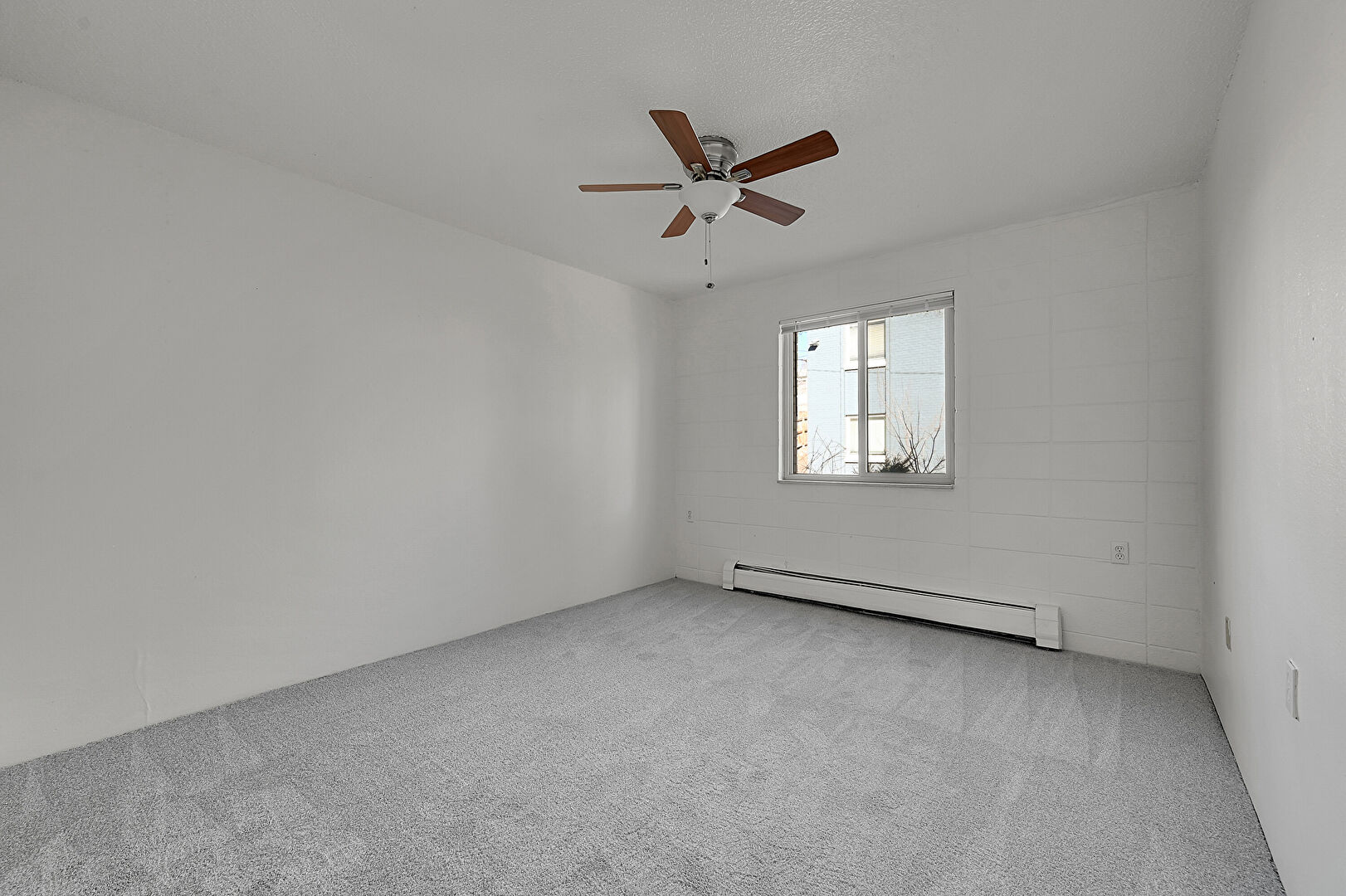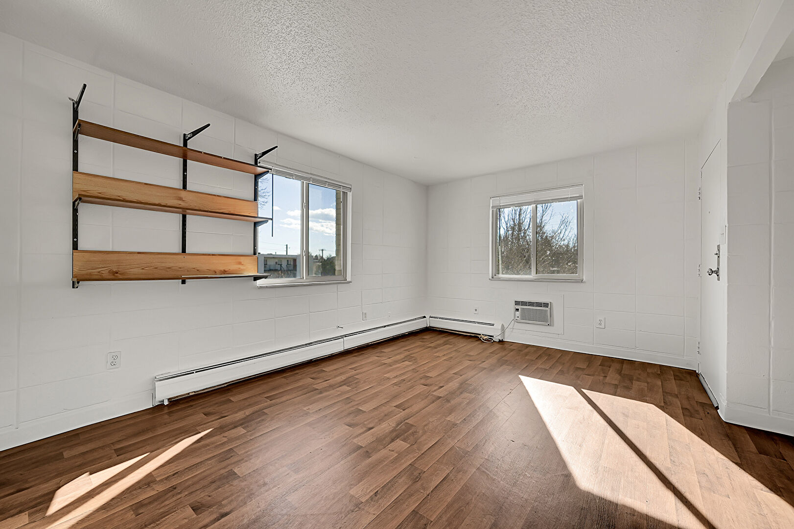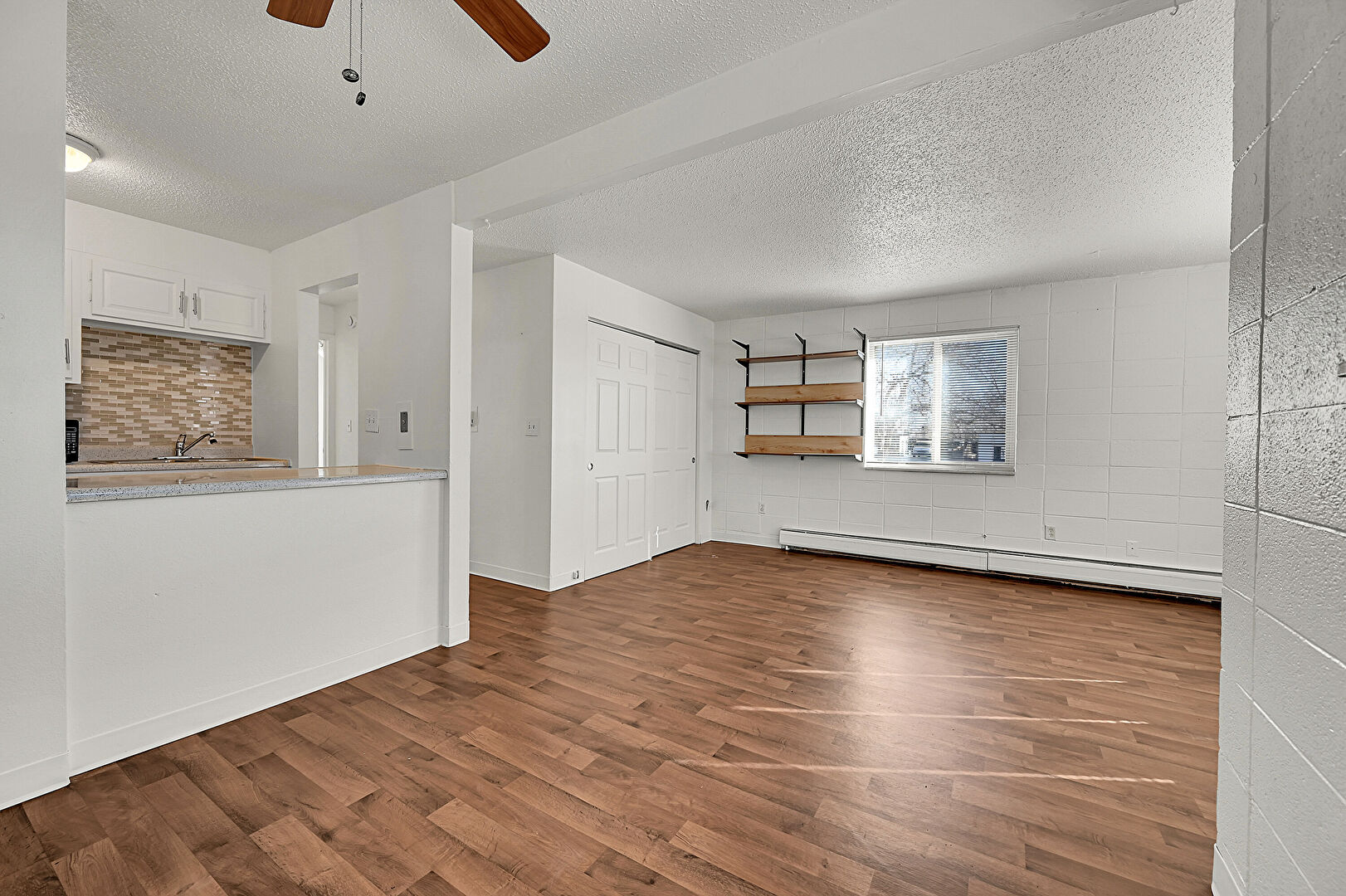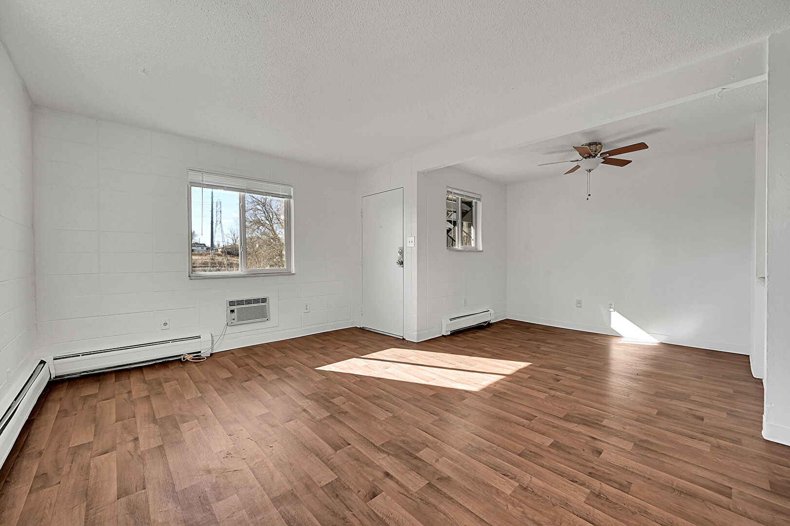 Baseboard Radiator, Baseboards Wall, Ceiling Fan, Concrete Block Wall, Drywall, Natural Light, Textured Ceiling, Wall Mounted Ac, Wood Finish Floor, Baseboards Wall, Ceiling Fan, Natural Light, Wall Mounted Ac