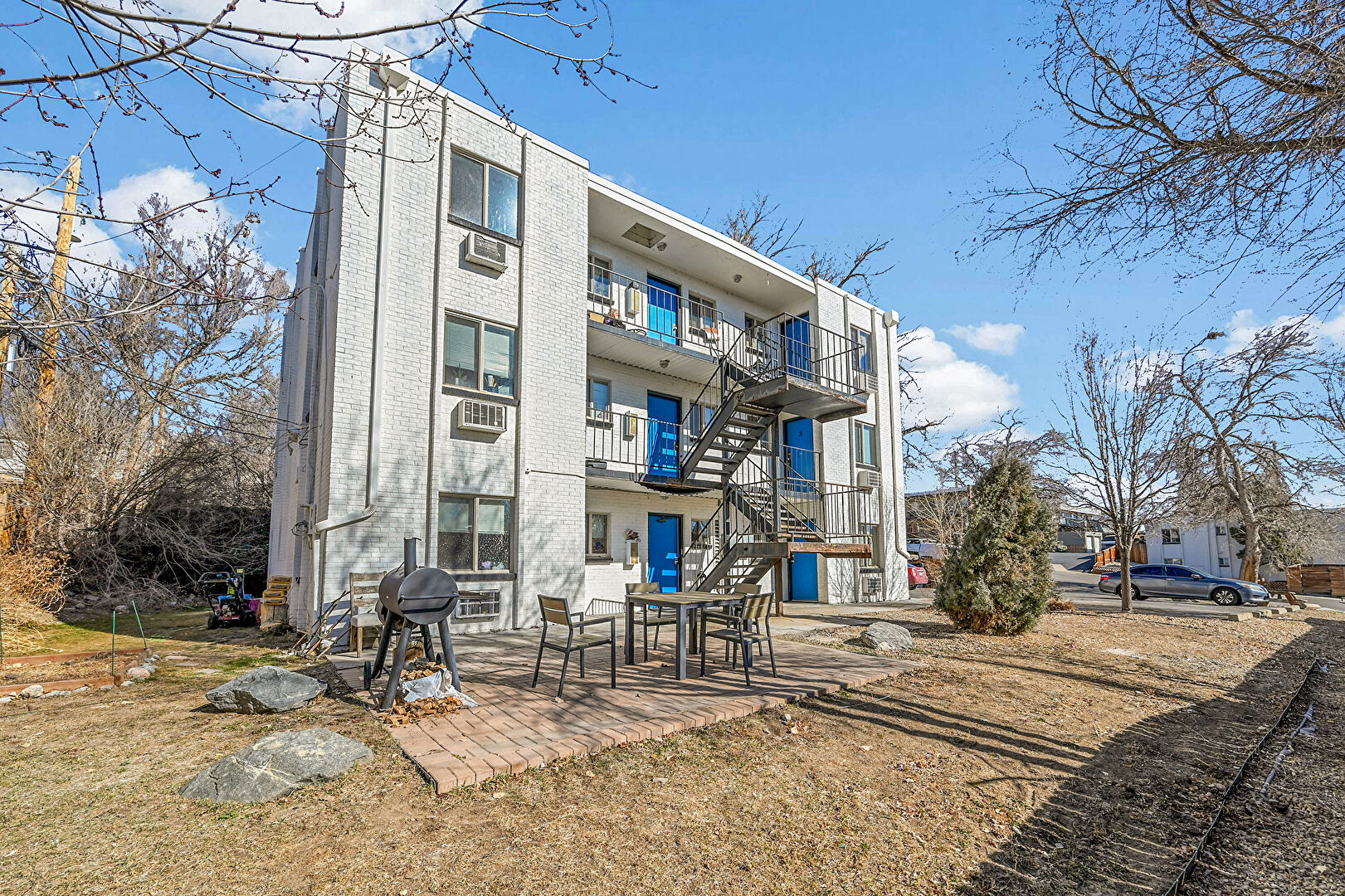 Apartment Complex View, Balcony, Brick Siding, Downspout, Grill, Gutters, Outdoor Dining Area, Patio, Stairs