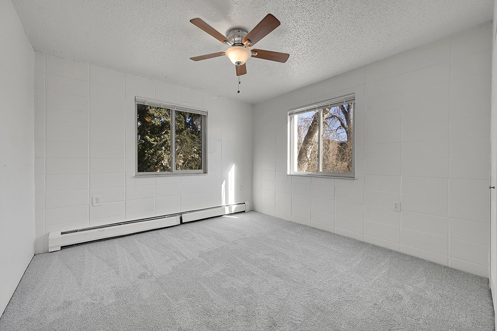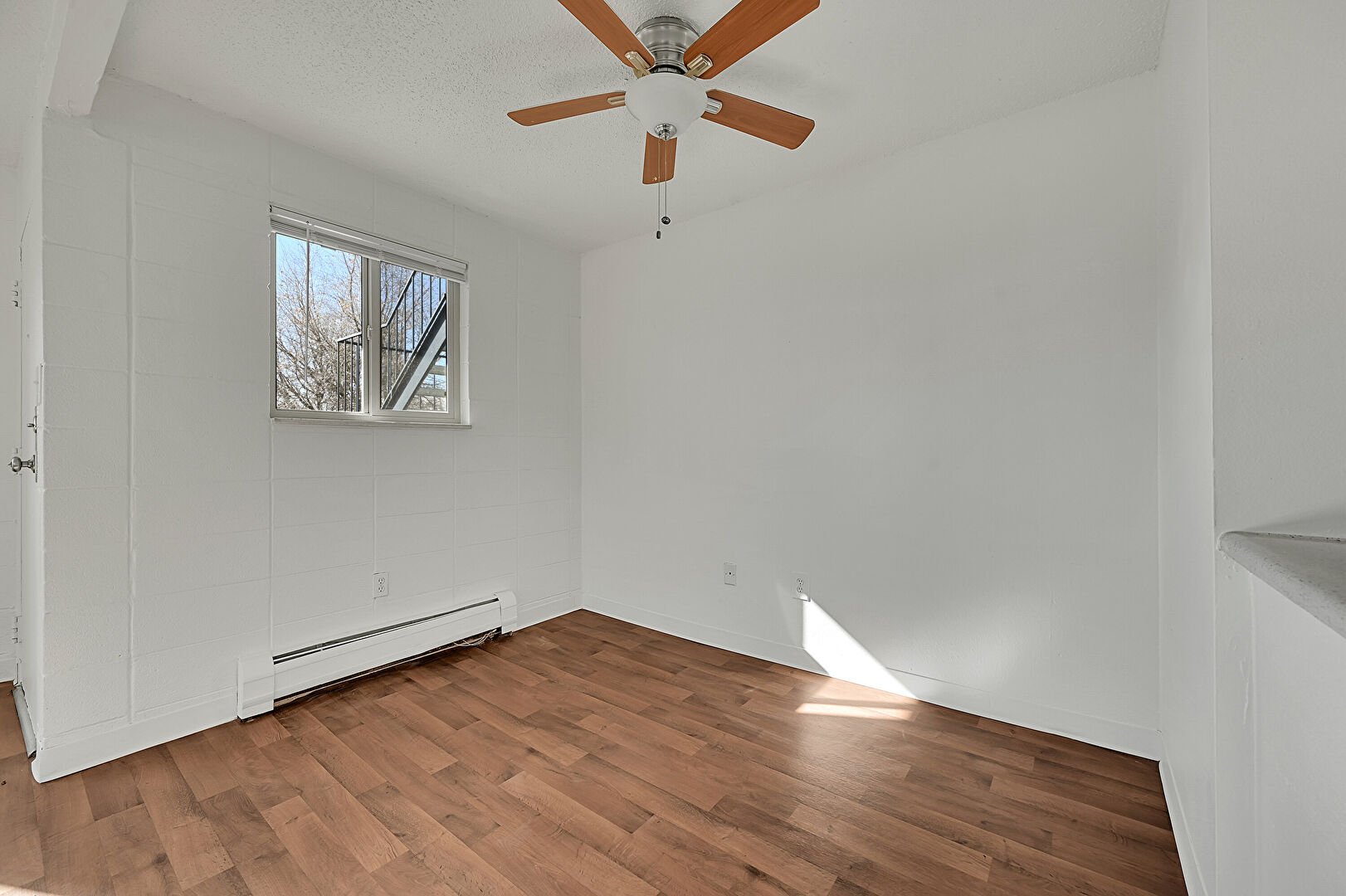 Baseboard Radiator, Baseboards Wall, Ceiling Fan, Concrete Block Wall, Drywall, Natural Light, Textured Ceiling, Wood Finish Floor, Natural Light, Wood Finish Floor