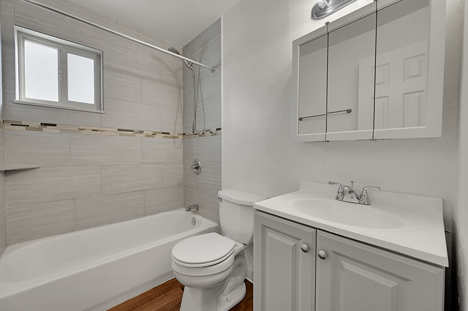 Combined Bath Shower, Drywall, Full Bathroom, Natural Light, Wood Finish Floor, Vanity