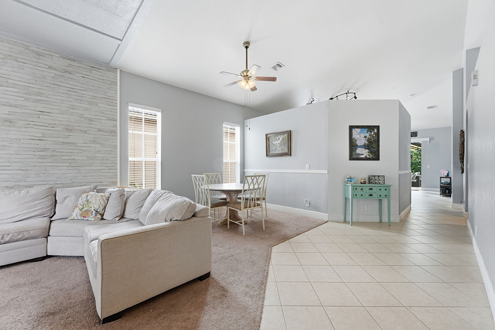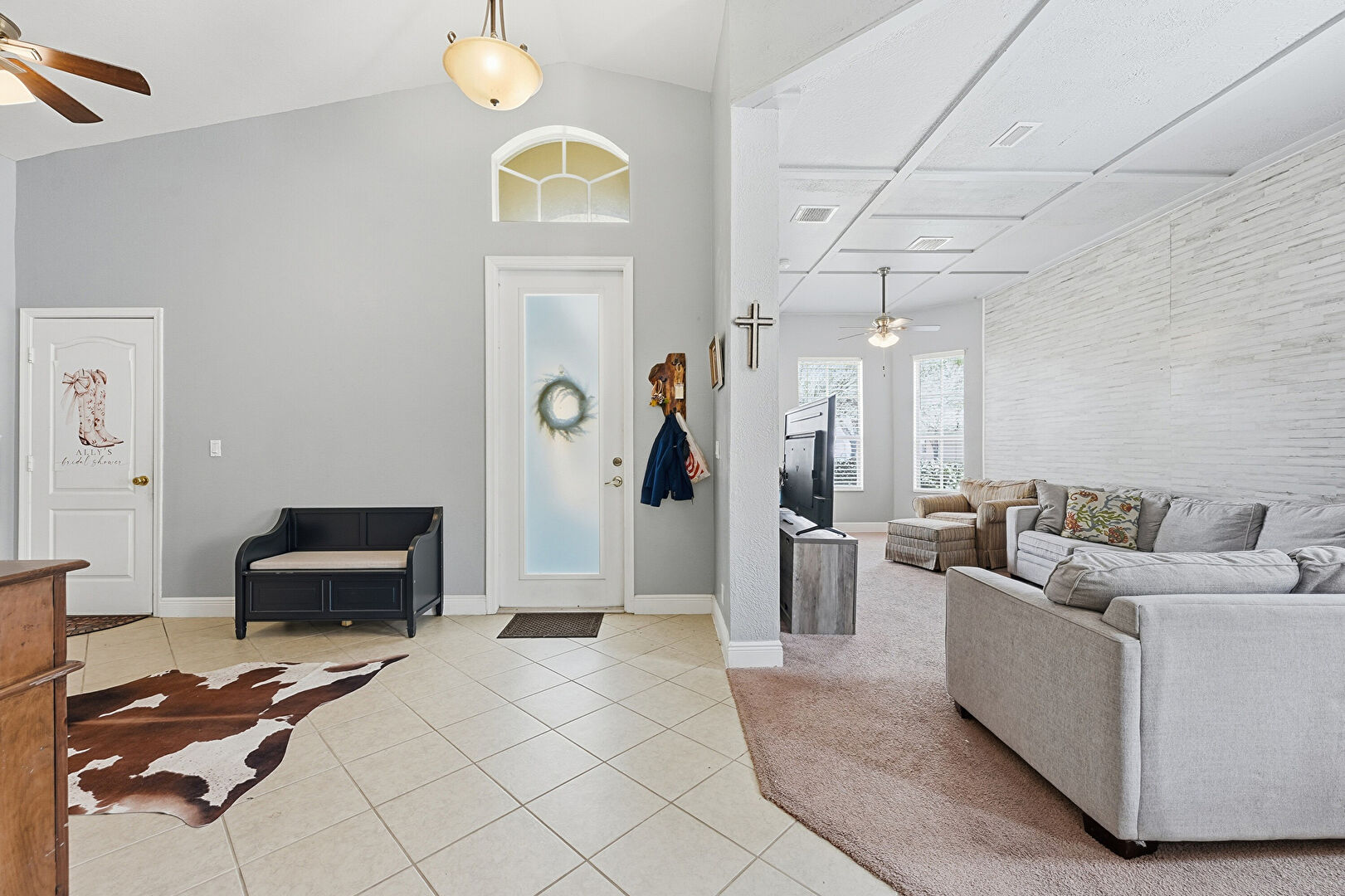 Accent Wall, Arched Walkways, Baseboards Wall, Carpet, Cathedral Ceiling, Ceiling Fan, Drywall, High Ceiling, Natural Light, Tile Floor, Vaulted Ceiling, Vent, Arched Walkways, Baseboards Wall, Vaulted Ceiling