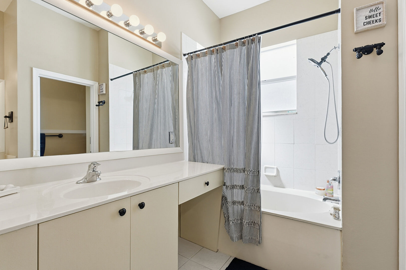 Baseboards Wall, Combined Bath Shower, Drywall, Full Bathroom, Natural Light, Tile Floor, Vanity, Natural Light, Tile Floor