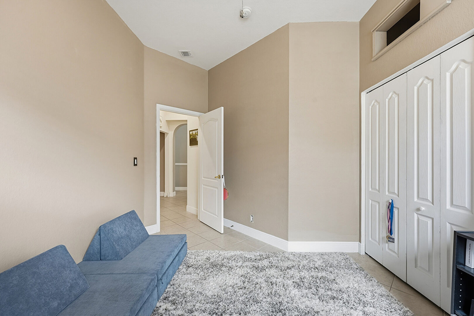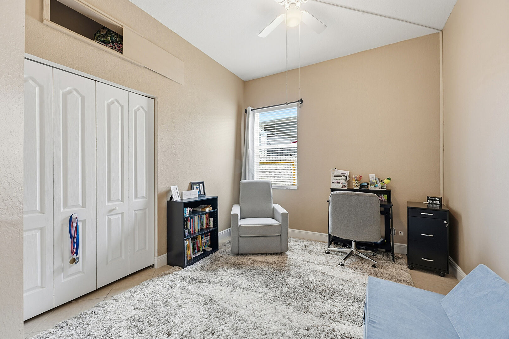 Baseboards Wall, Ceiling Fan, Closet, Drywall, High Ceiling, Natural Light, Office Area, Smoke Carbon Monoxide Detector, Tile Floor, Vent, Baseboards Wall, Carpet, High Ceiling, Tile Floor