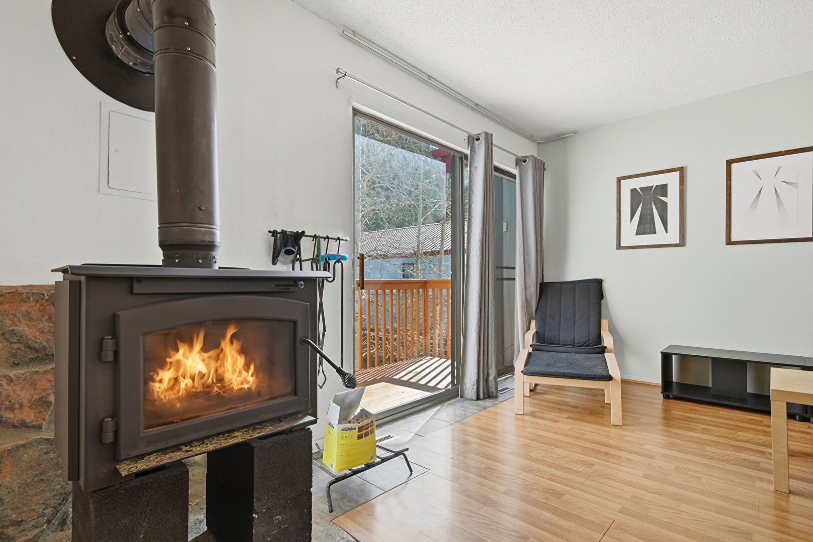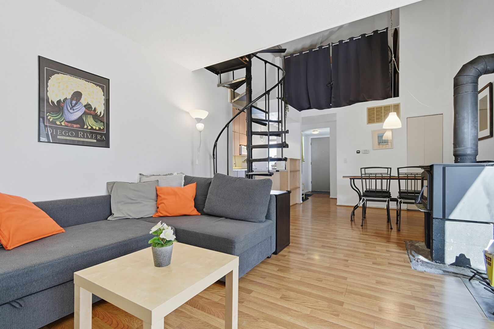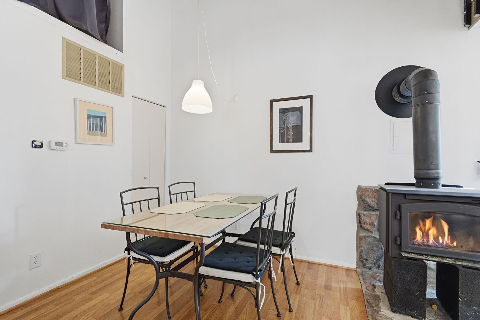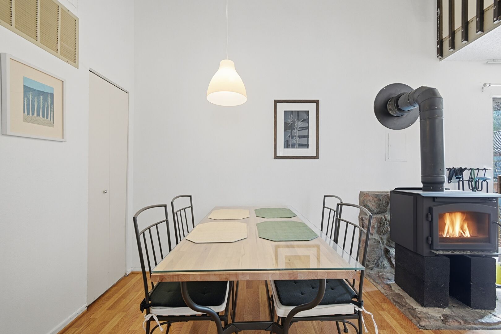 Baseboards Wall, Drywall, High Ceiling, Natural Light, Stairs, Vent, Wood Finish Floor, Wood Stove, Baseboards Wall, Wood Finish Floor, Wood Stove