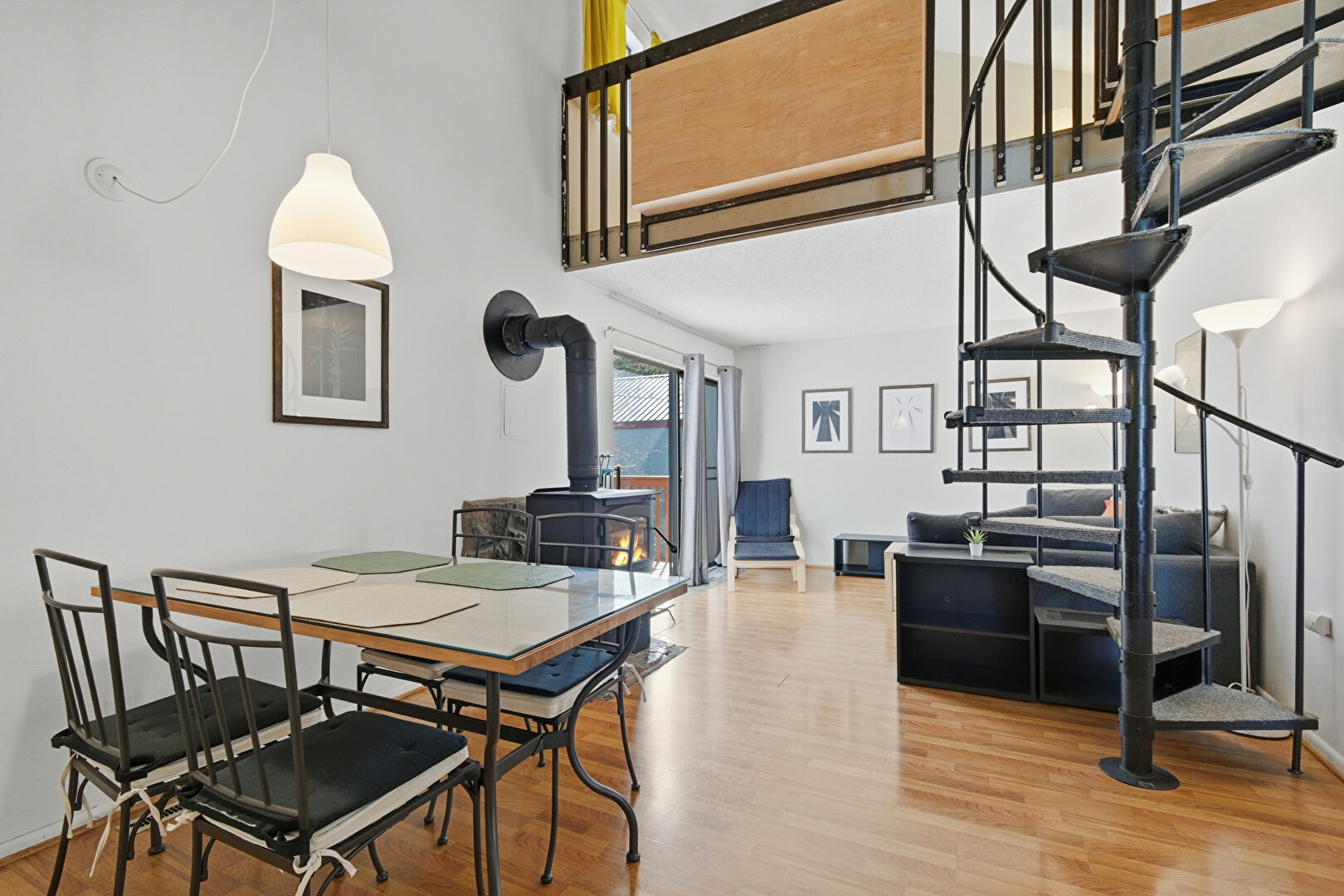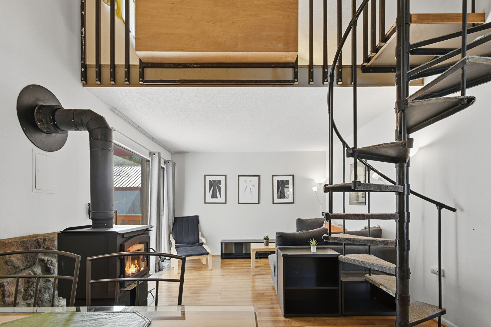 Drywall, High Ceiling, Natural Light, Stairs, Textured Ceiling, Vent, Wood Finish Floor, Wood Stove, Baseboards Wall, Drywall, Stairs, Wood Finish Floor