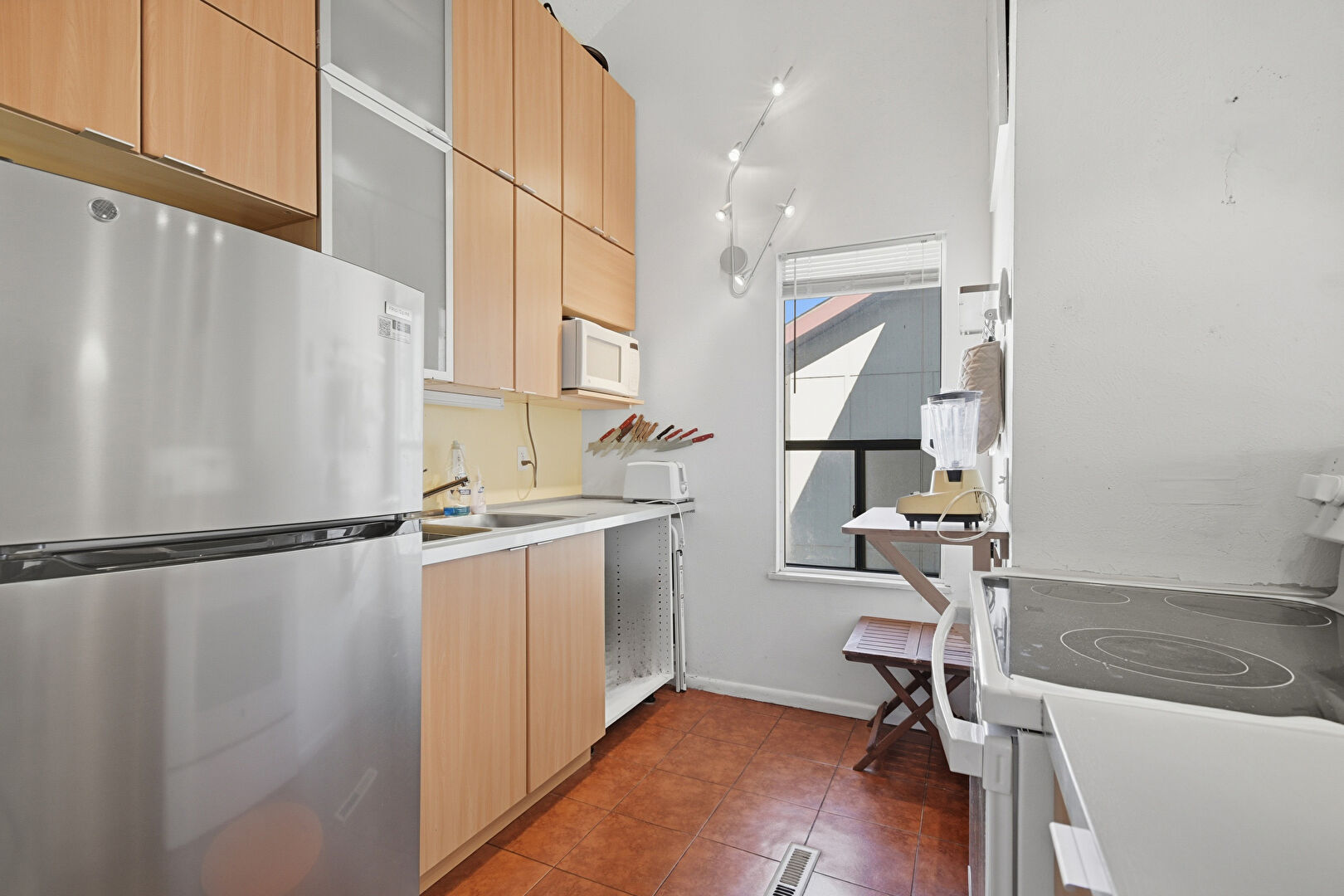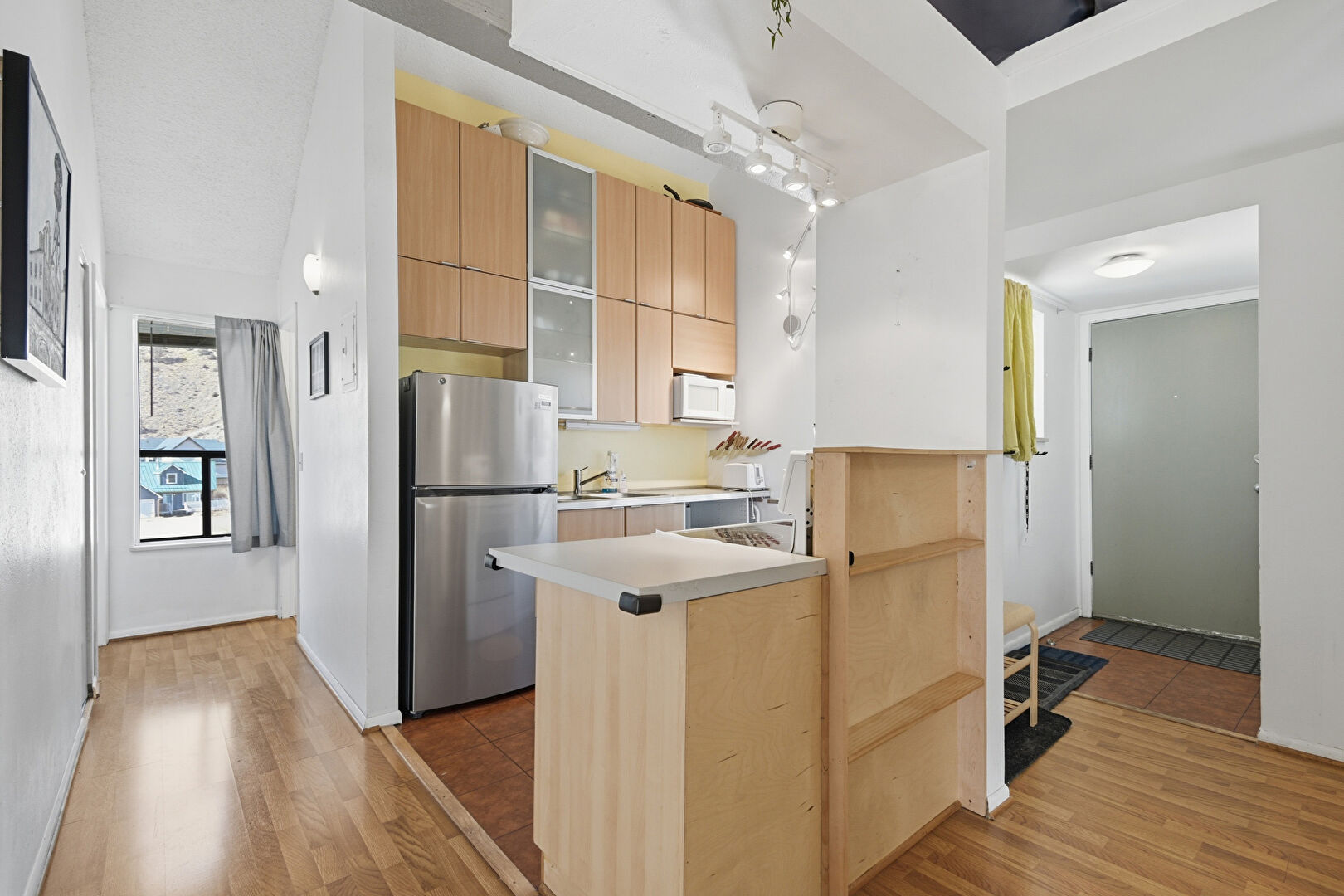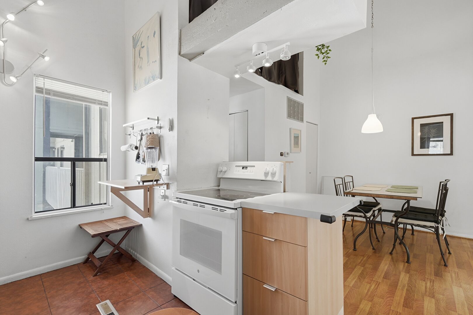 Baseboards Wall, Drywall, Flat Panel Cabinets, High Ceiling, Kitchen Peninsula, Natural Light, Pendant Lighting, Tile Floor, Vent, Wood Finish Floor, Flat Panel Cabinets, Glass Insert Cabinets, Wood Finish Floor