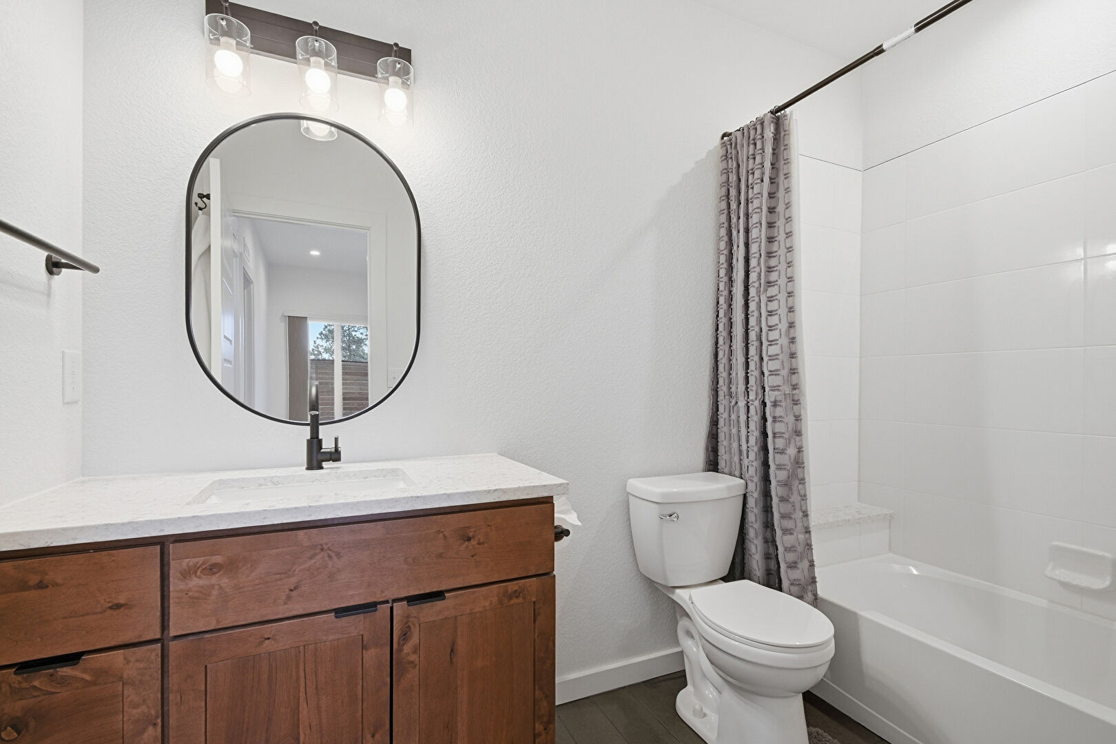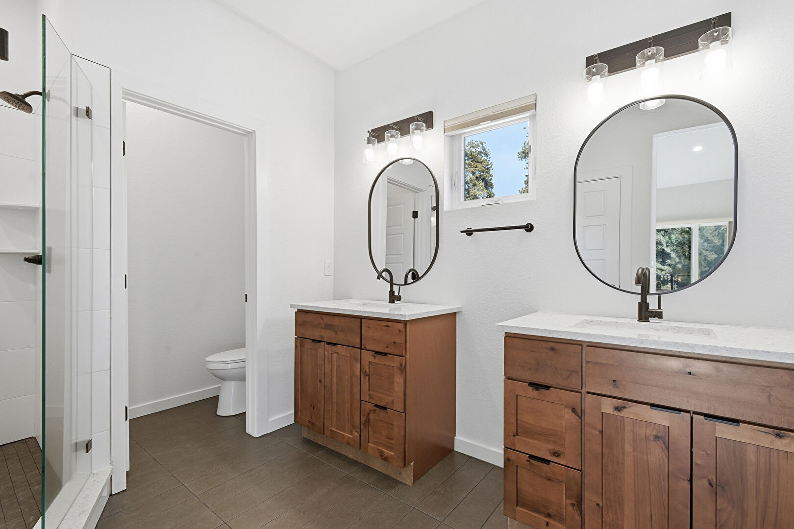 Baseboards Wall, Combined Bath Shower, Drywall, Full Bathroom, Natural Light, Textured Wall, Tile Floor, Two Single Vanities, Wood Finish Floor, Combined Bath Shower, Vanity, Water Closet