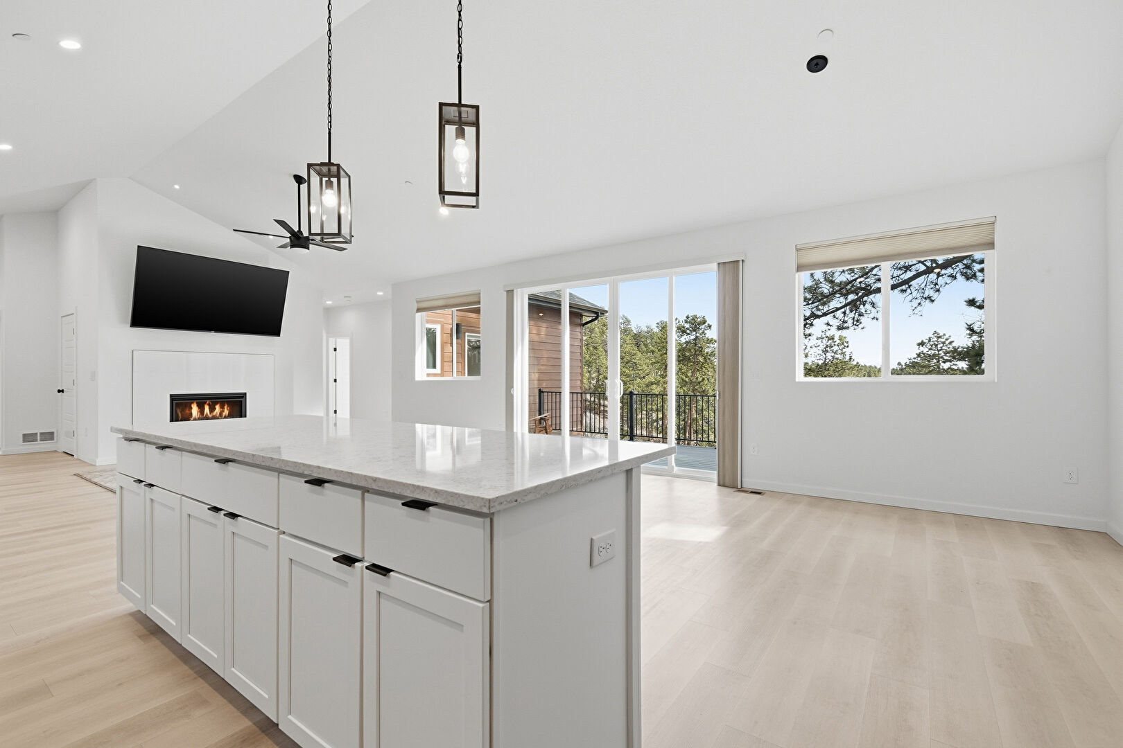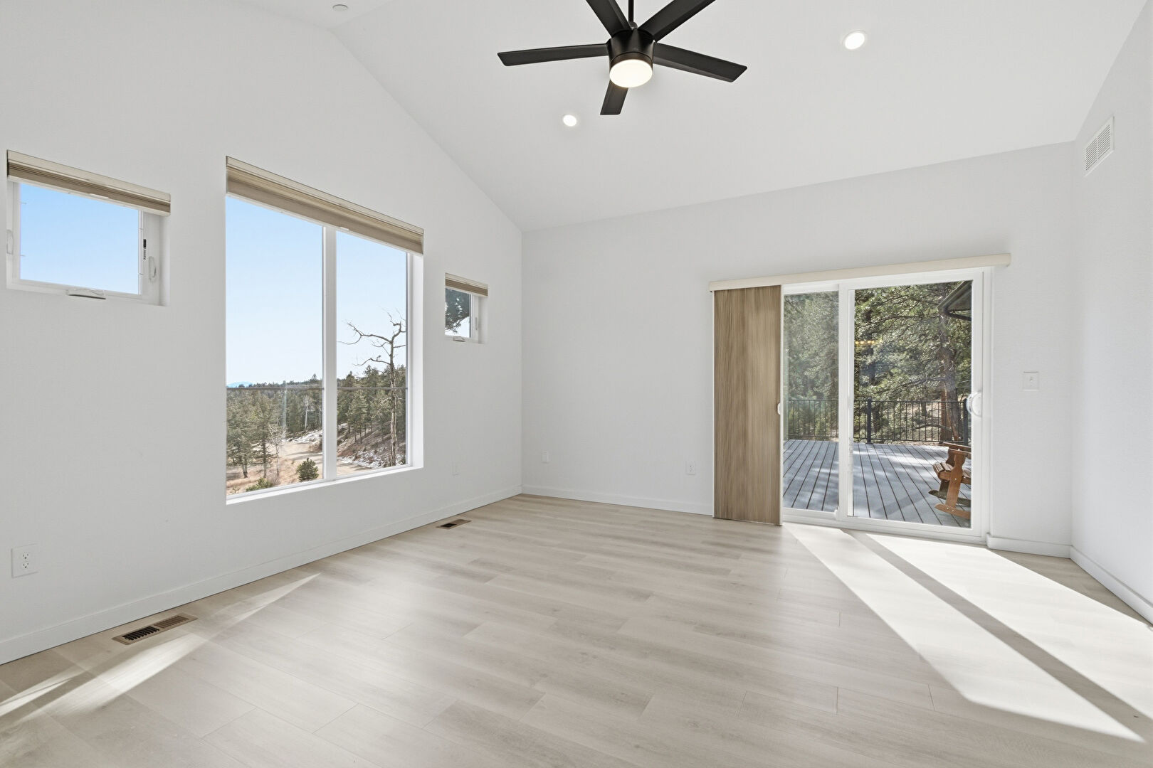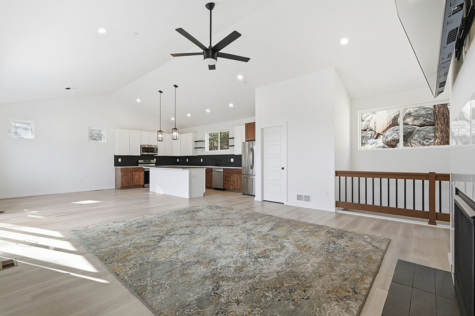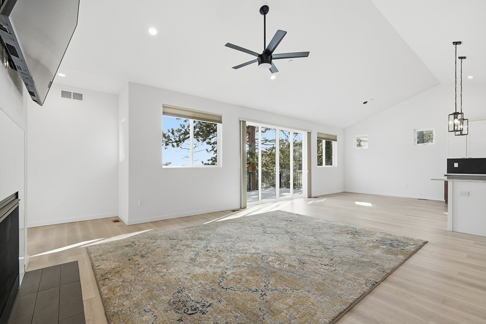 Baseboards Wall, Ceiling Fan, Drywall, Fireplace, High Ceiling, Natural Light, Recessed Lighting, Vaulted Ceiling, Vent, Wood Finish Floor, Fireplace, Recessed Lighting, Vaulted Ceiling