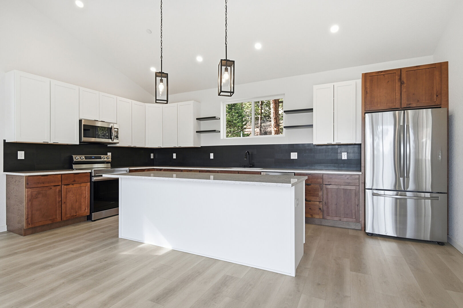 Baseboards Wall, Cathedral Ceiling, Ceiling Fan, Drywall, Fireplace, High Ceiling, Kitchen Island, L Shaped Kitchen, Medium Brown Cabinets, Natural Light, Open Shelves, Opens To Living Area, Pendant Lighting, Recessed Lighting, Shaker Cabinets, Stone Countertops, Vaulted Ceiling, Vent, Wood Finish Floor, Drywall, Natural Light, Opens To Living Area, Shaker Cabinets