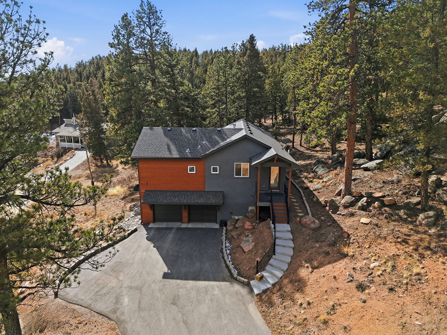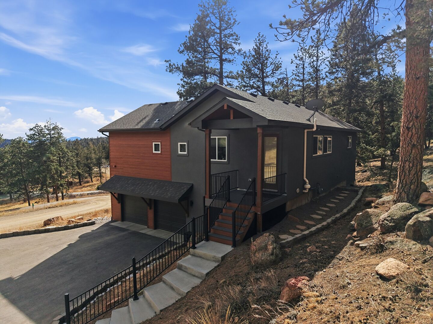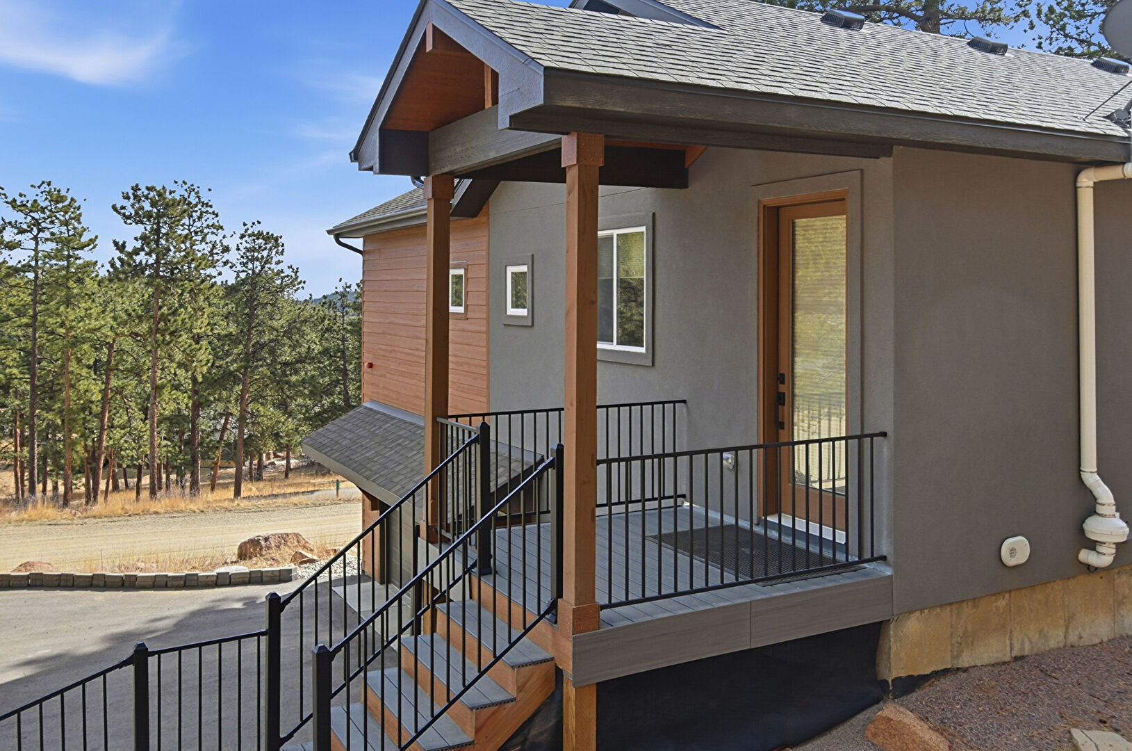 Basement Garage, Built In Garage, Downspout, Driveway, Gutters, Horizontal Siding, Porch, Satellite Dish, Shingle Roof, Stairs, Stoop, Stucco Siding, Woods View, Built In Garage, Horizontal Siding, Satellite Dish, Shingle Roof