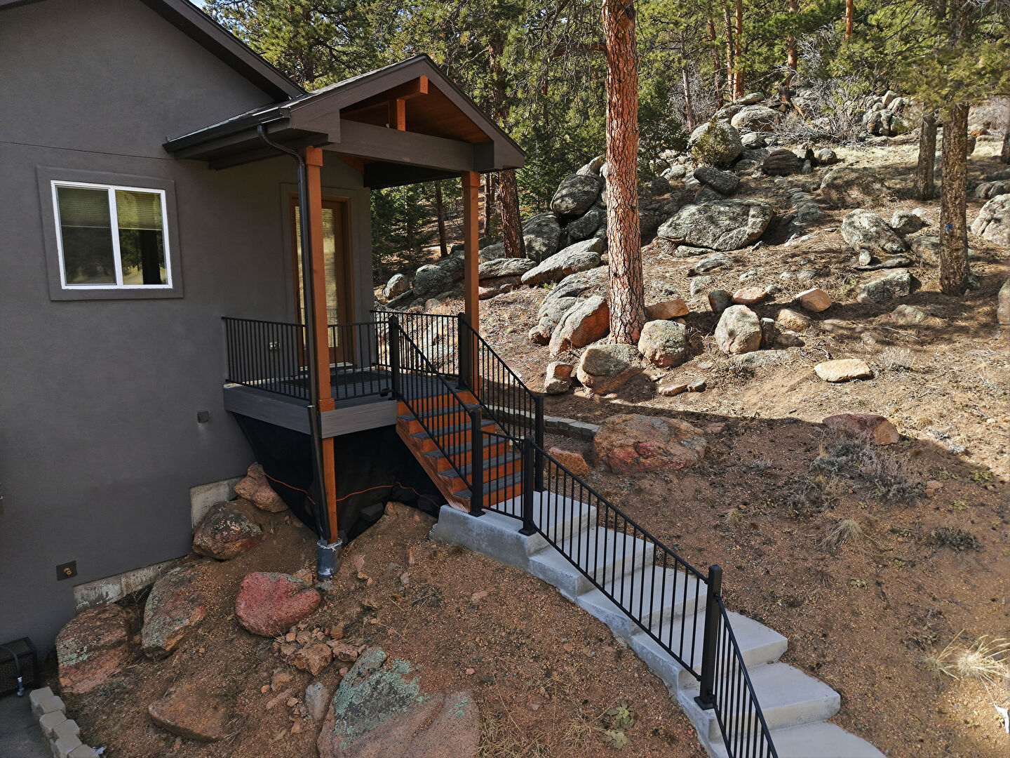 Concrete Foundation, Downspout, Gutters, Horizontal Siding, Porch, Shingle Roof, Stoop, Stucco Siding, Stairs