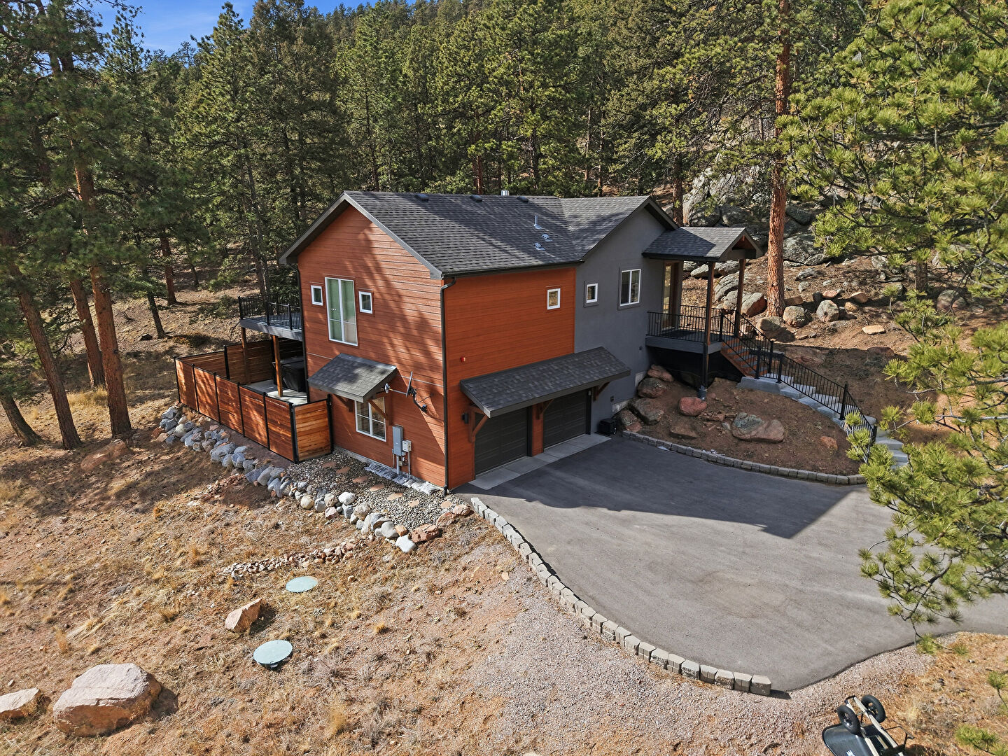 Basement Garage, Built In Garage, Deck, Downspout, Driveway, Horizontal Siding, Shingle Roof, Stairs, Wood Siding, Woods View, Gutters, Shingle Roof