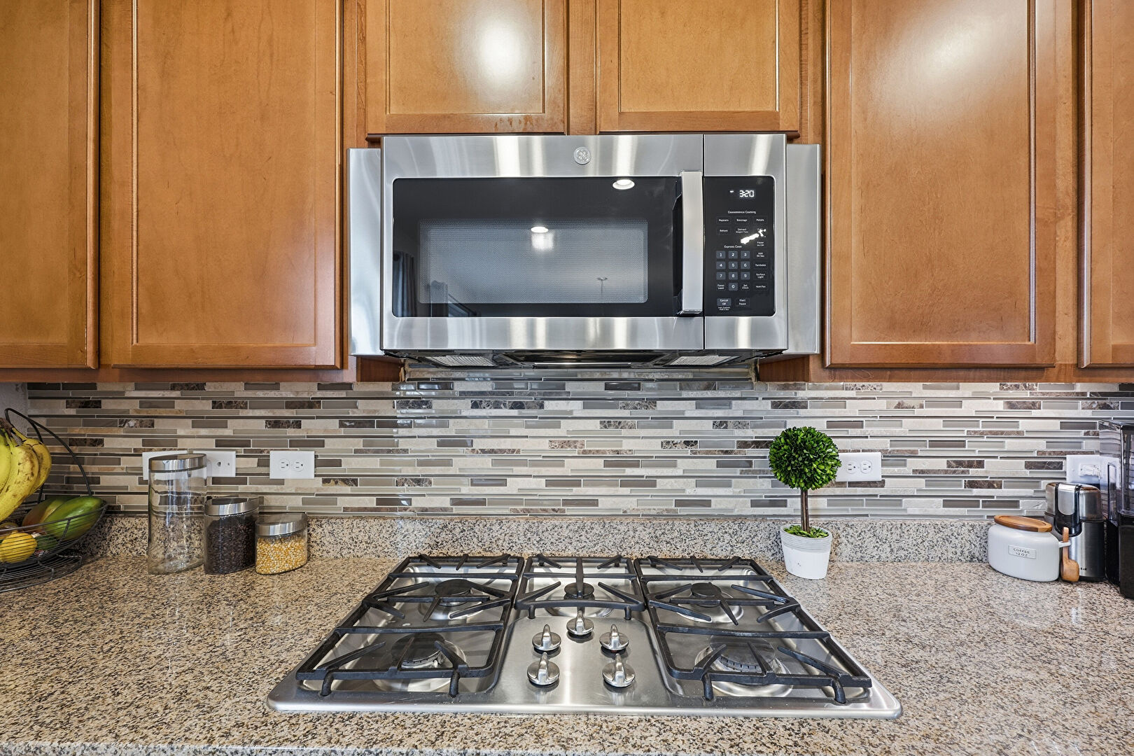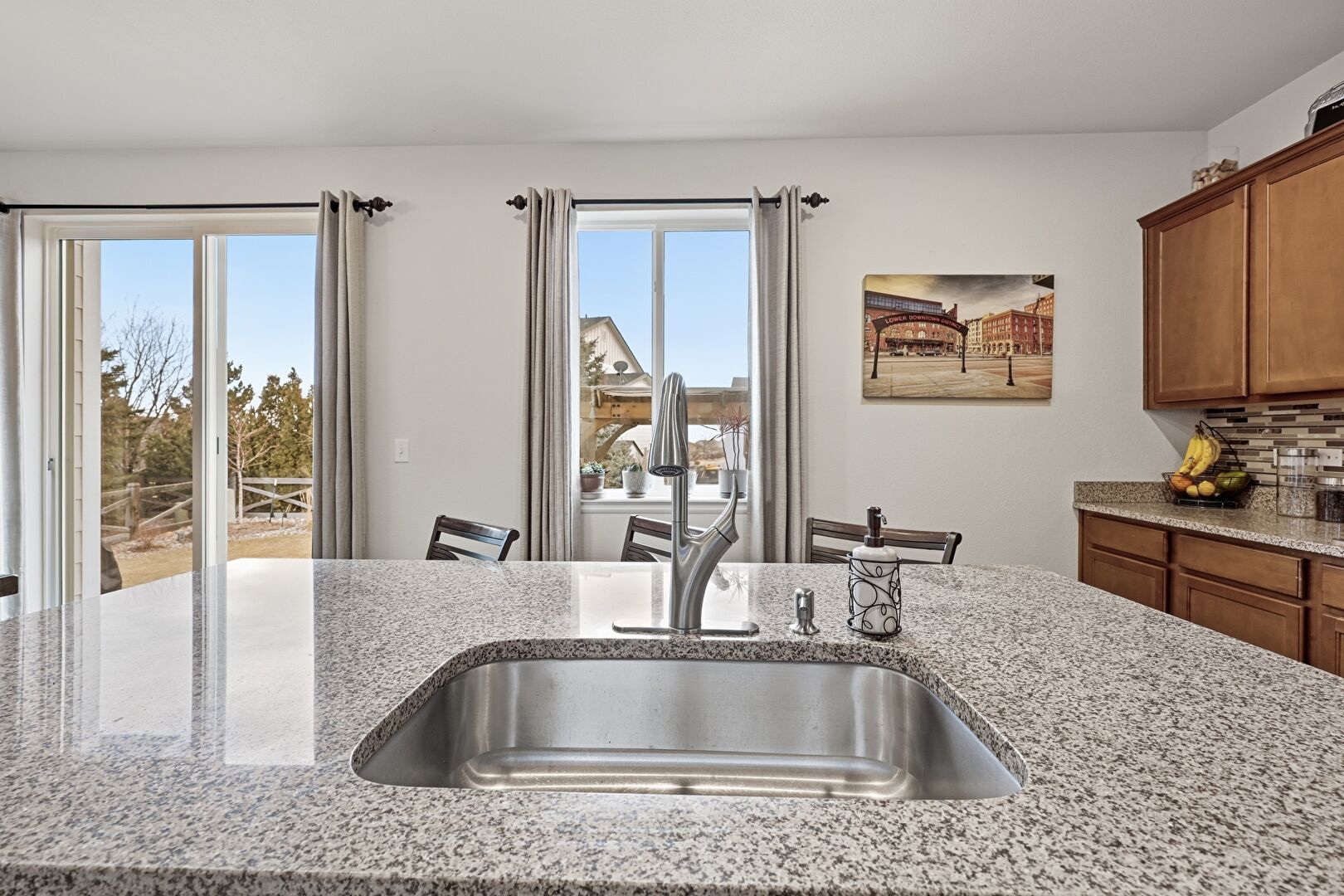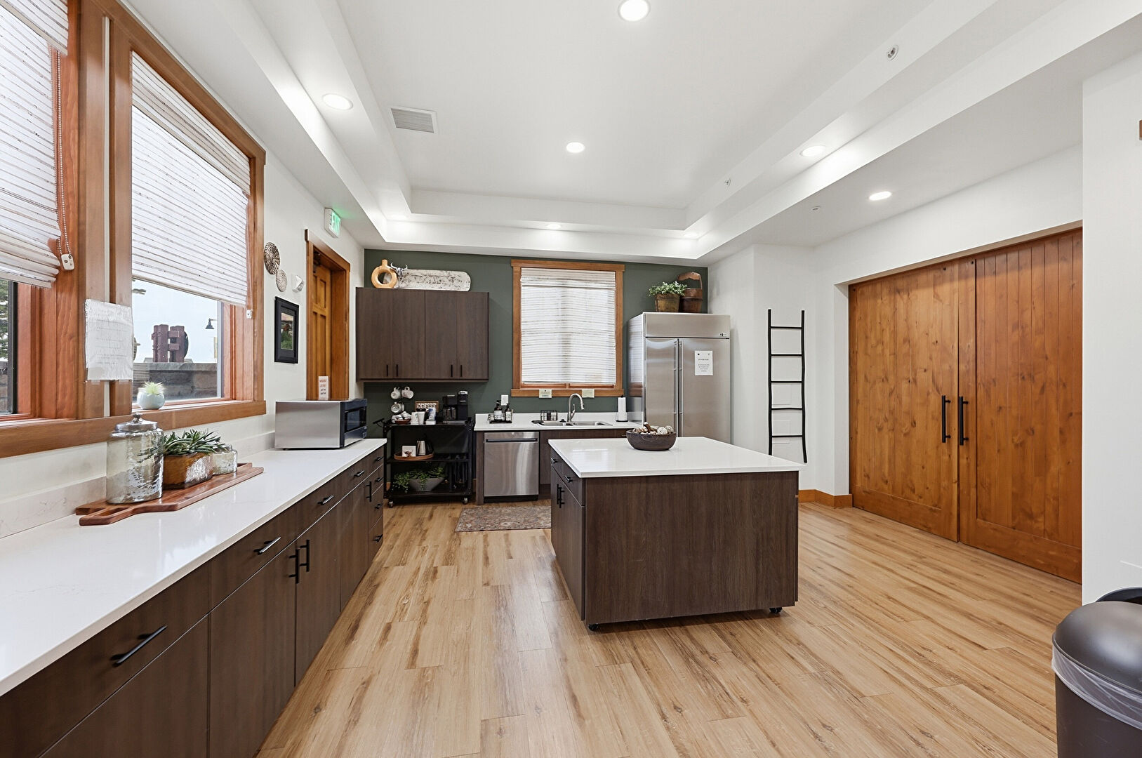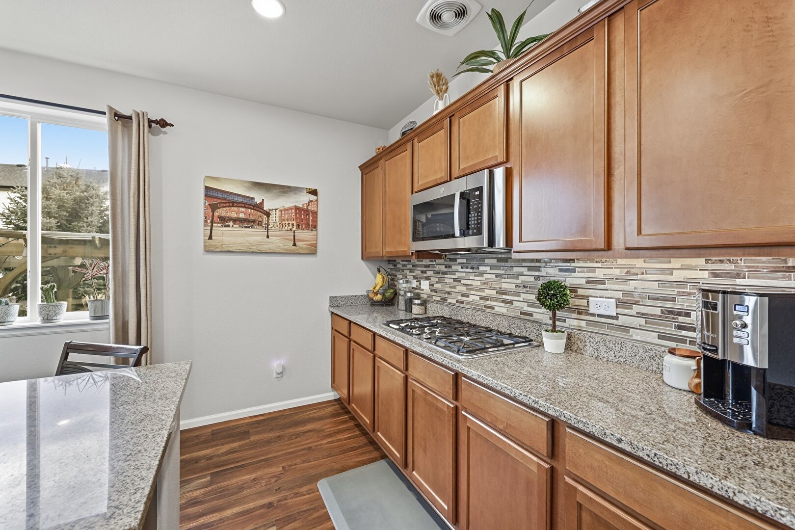 Baseboards Wall, Ceiling Fan, Crown Molding Cabinets, Dark Brown Cabinets, Double Oven, Drywall, Fireplace, Kitchen Bar, Kitchen Island, L Shaped Kitchen, Medium Brown Cabinets, Natural Light, Notable Chandelier, Opens To Living Area, Pendant Lighting, Recessed Lighting, Shaker Cabinets, Stone Countertops, Vent, Wood Finish Floor, Black Cabinets, Double Oven, Drywall, Medium Brown Cabinets, Natural Light, Recessed Lighting