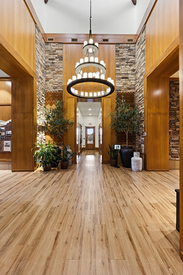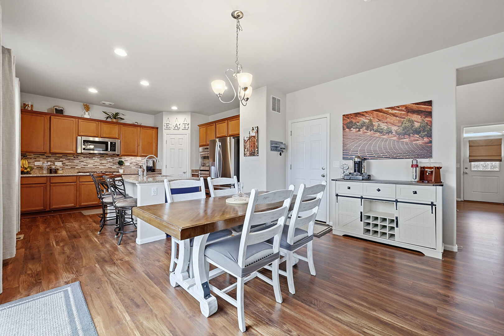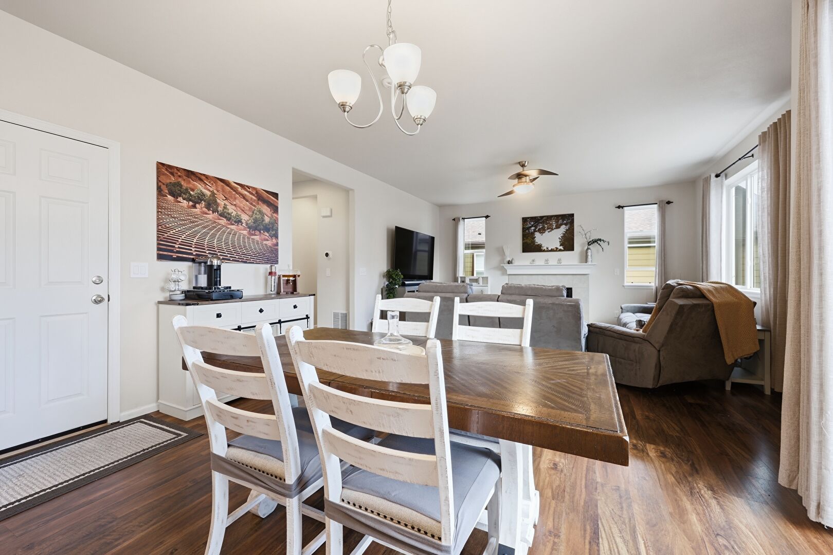 Baseboards Wall, Ceiling Fan, Drywall, L Shaped Kitchen, Natural Light, Notable Chandelier, Recessed Lighting, Vent, Wood Finish Floor, Fireplace, L Shaped Kitchen, Notable Chandelier