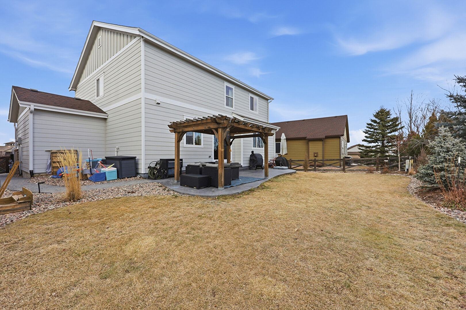 Concrete Foundation, Downspout, Entry Steps, Fence, Grill, Gutters, Horizontal Siding, Lawn, Outdoor Living Space, Patio, Pergola, Vertical Siding, Board Batten Siding, Concrete Foundation, Fence