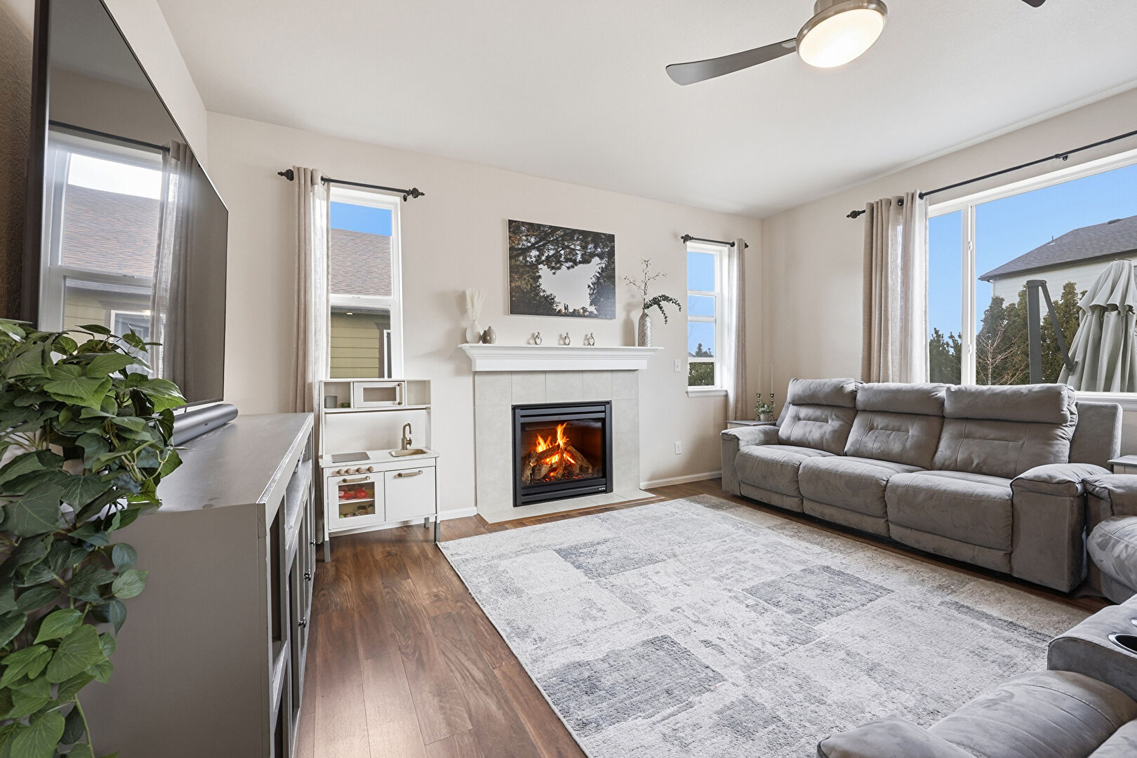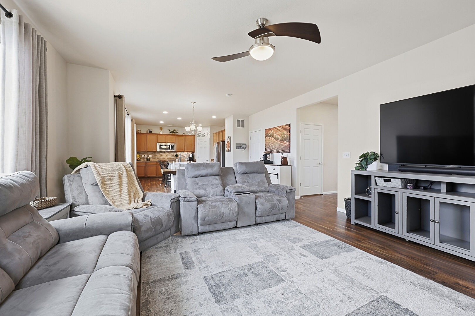 Baseboards Wall, Drywall, Fireplace, L Shaped Kitchen, Natural Light, Notable Chandelier, Recessed Lighting, Wood Finish Floor, Ceiling Fan, Drywall, Vent