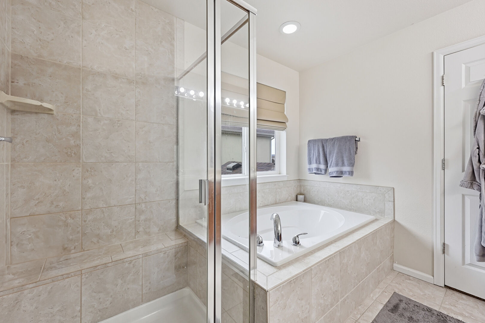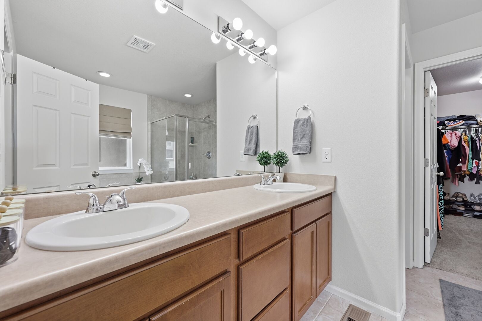Baseboards Wall, Double Vanity, Drywall, Full Bathroom, Recessed Lighting, Tile Floor, Walk In Closet, Natural Light, Vent
