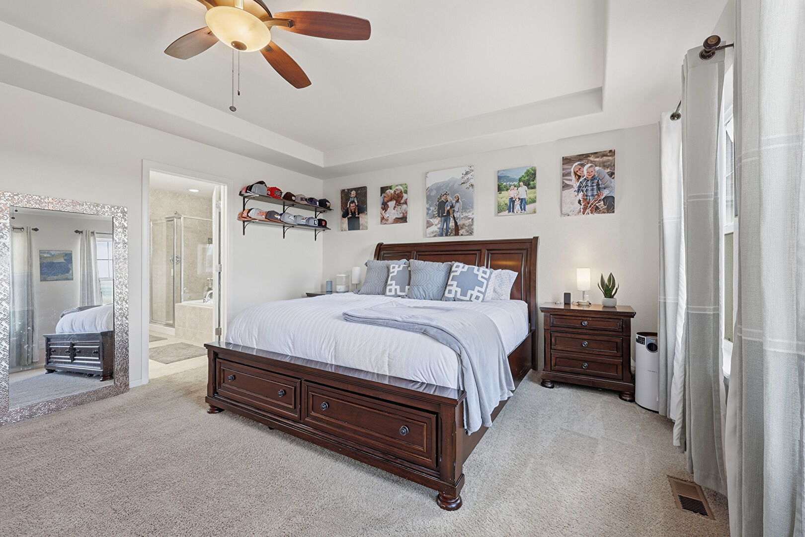 Baseboards Wall, Carpet, Ceiling Fan, Drywall, Ensuite Bathroom, Natural Light, Tray Ceiling, Vent, Carpet, Drywall