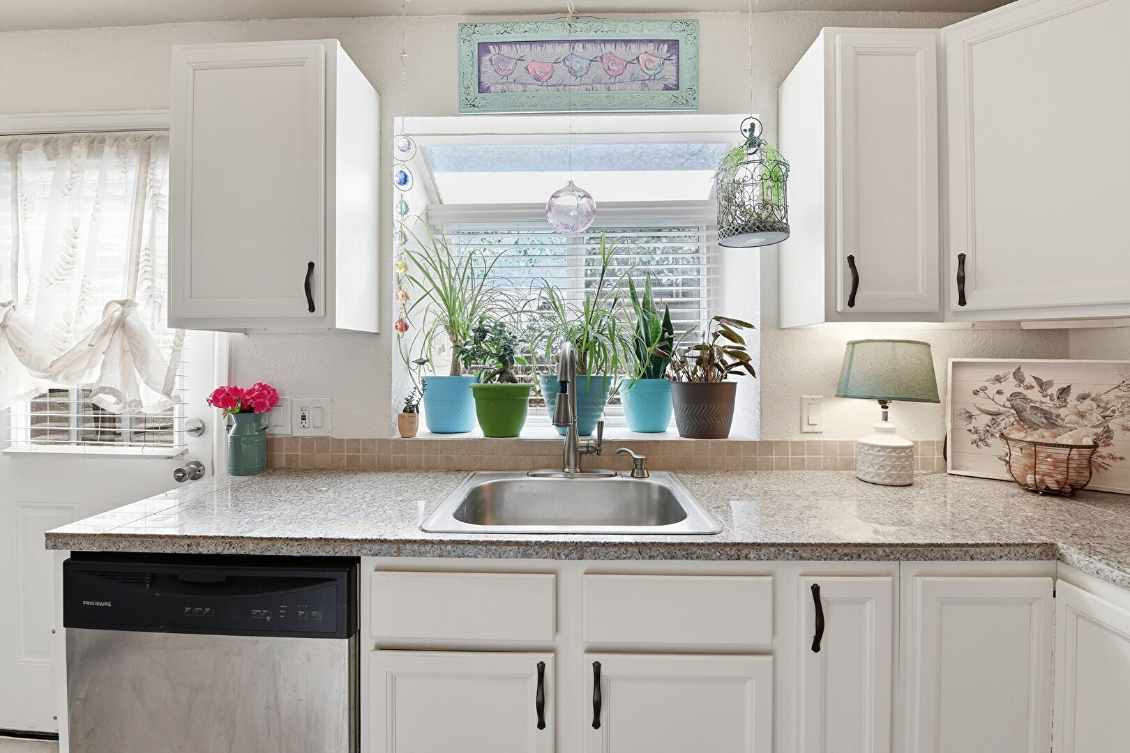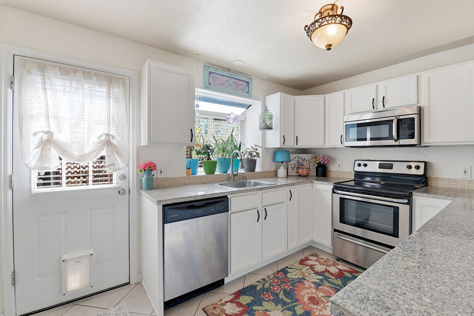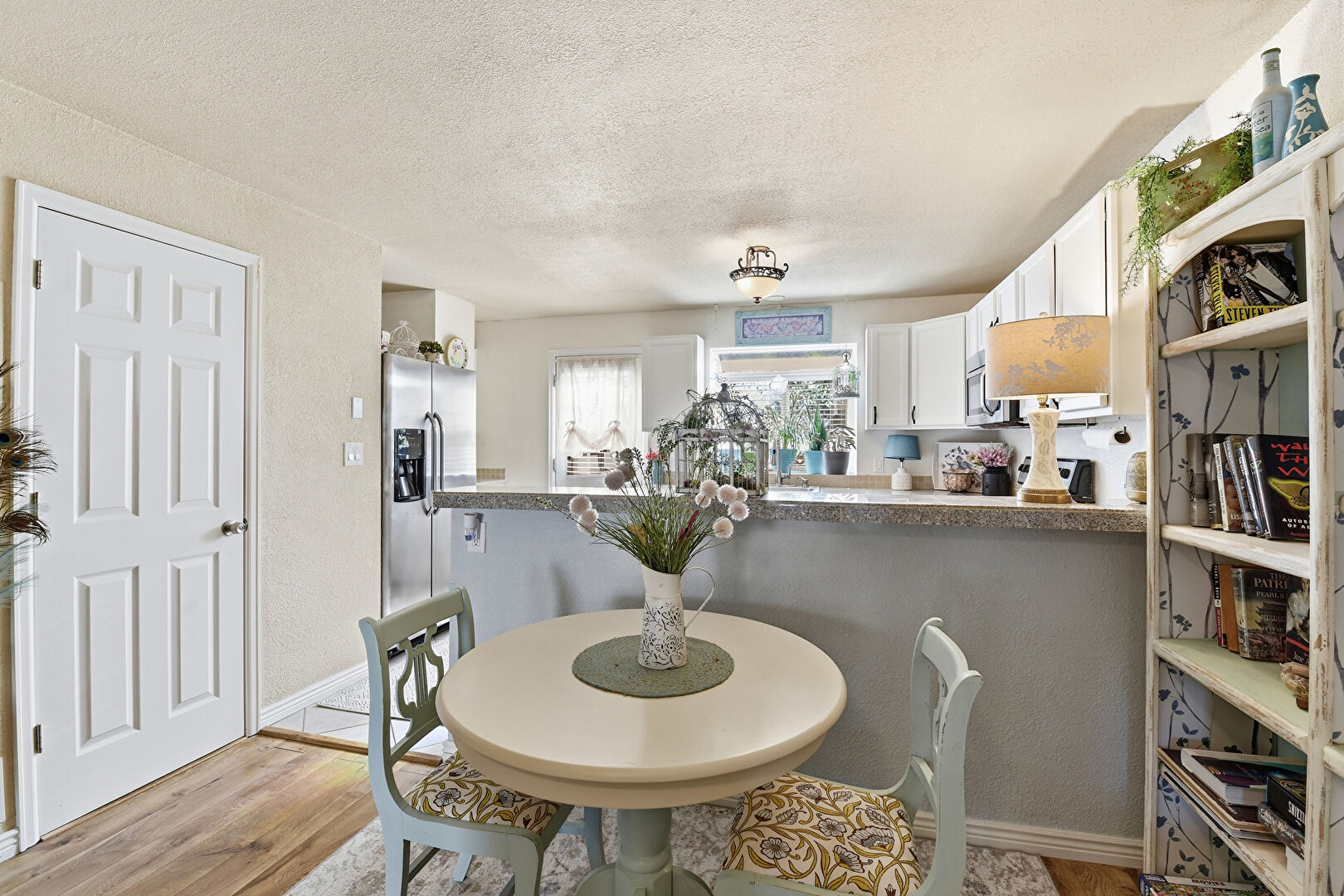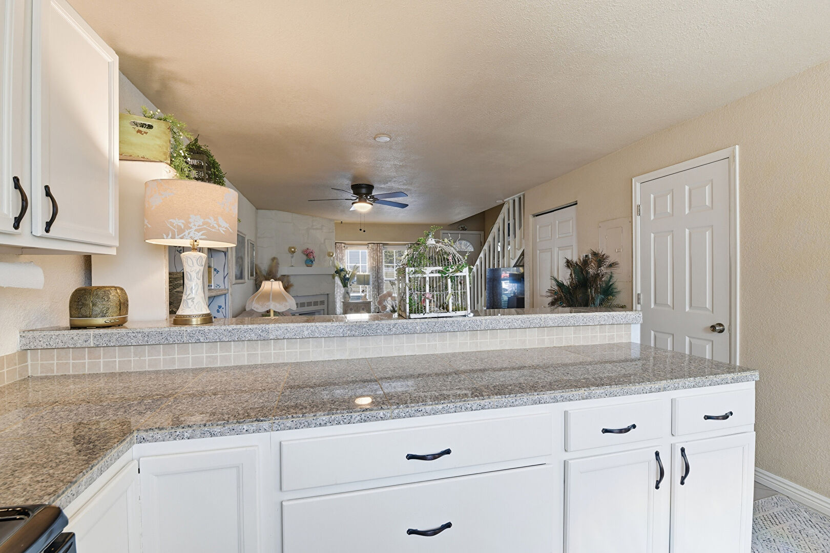 Baseboards Wall, Ceiling Fan, Drywall, Kitchen Peninsula, Natural Light, Opens To Living Area, Shaker Cabinets, Stone Countertops, Textured Wall, Tile Floor, Ceiling Fan, Shaker Cabinets, Textured Wall, Tile Floor