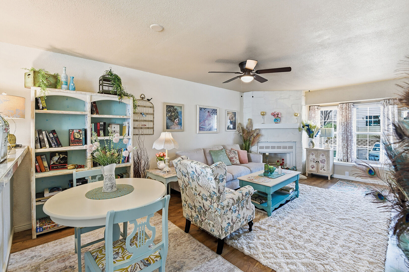 Baseboards Wall, Drywall, Fireplace, Natural Light, Textured Ceiling, Textured Wall, U Shaped Kitchen, Wood Finish Floor, Ceiling Fan, Textured Wall, Vent