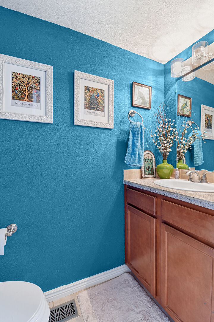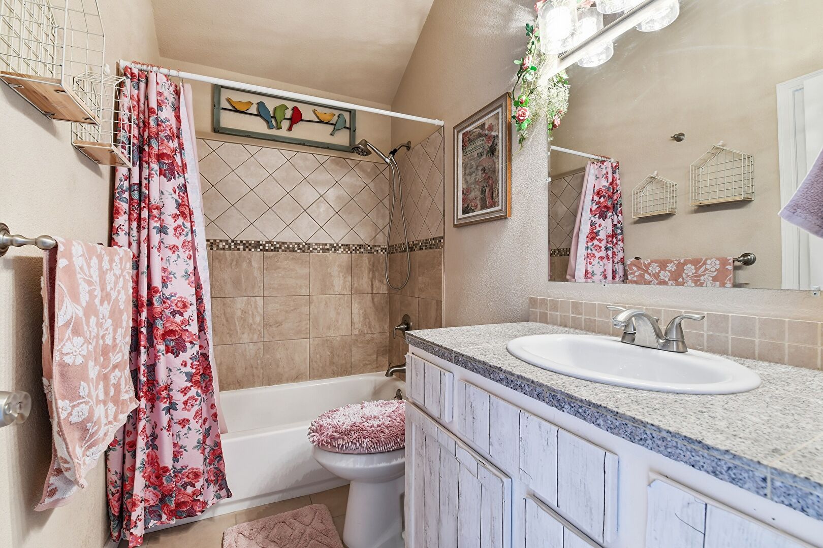 Combined Bath Shower, Drywall, Full Bathroom, Half Bathroom, Natural Light, Textured Ceiling, Textured Wall, Tile Floor, Vanity, Vent, Baseboards Wall, Full Bathroom, Vanity