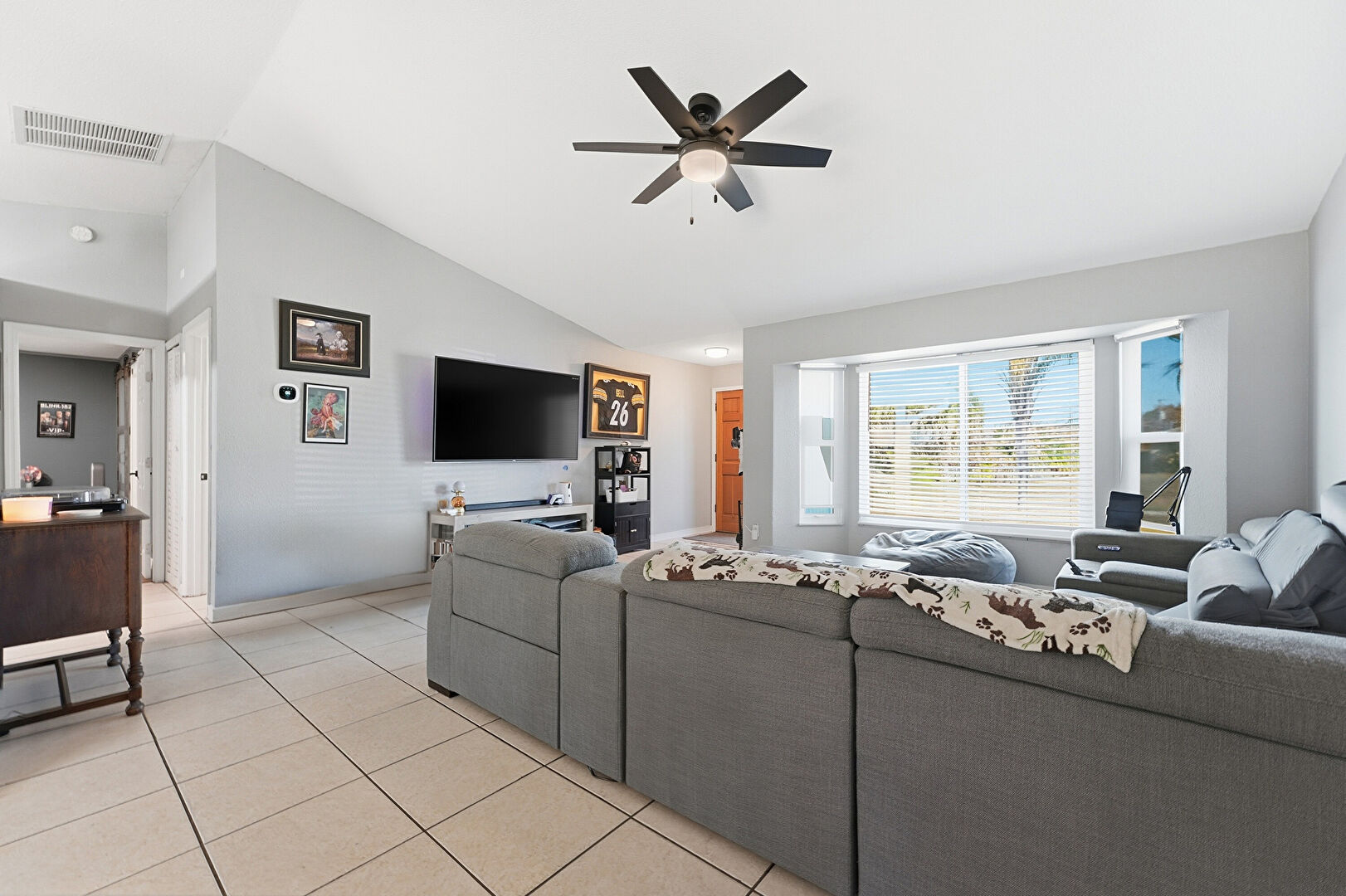 Baseboards Wall, Cathedral Ceiling, Ceiling Fan, Drywall, High Ceiling, Natural Light, Notable Chandelier, Tile Floor, Vaulted Ceiling, Vent, Natural Light, Vaulted Ceiling, Vent