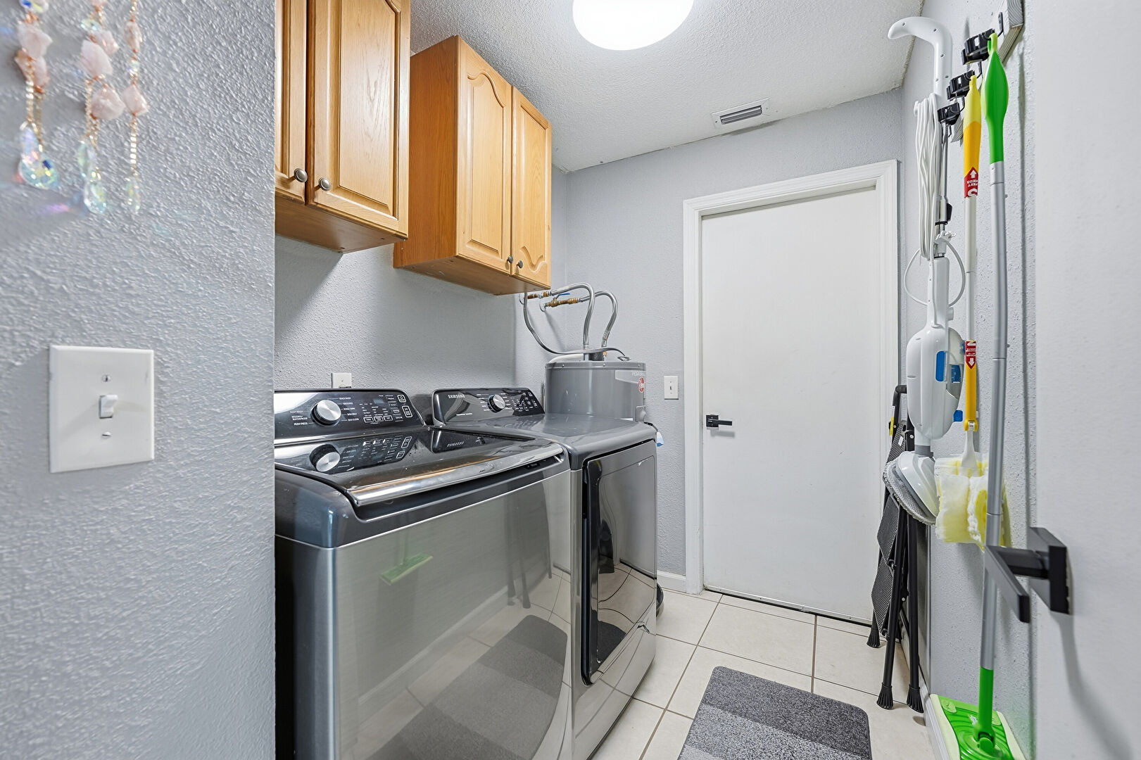 Baseboards Wall, Laundry, Textured Wall, Tile Floor, Vent, Water Heater, Textured Ceiling