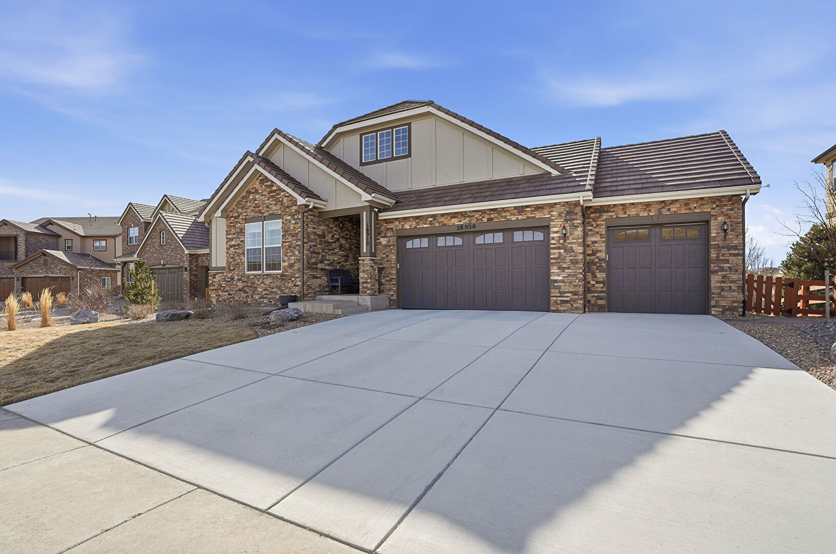 Board Batten Siding, Concrete Foundation, Downspout, Driveway, Fence, Gutters, Lawn, Residential View, Stone Siding, Stoop, Stucco Siding, Tile Roof, Vertical Siding, Concrete Foundation, Downspout, Driveway, Fence, Residential View
