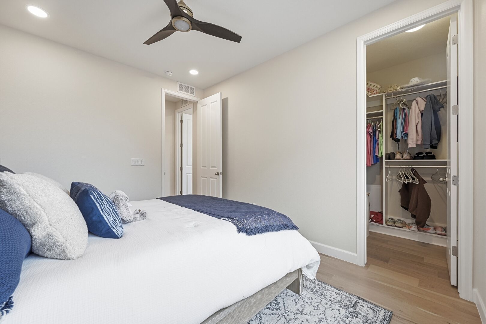 Baseboards Wall, Ceiling Fan, Drywall, Natural Light, Recessed Lighting, Vent, Wood Finish Floor, Drywall, Walk In Closet