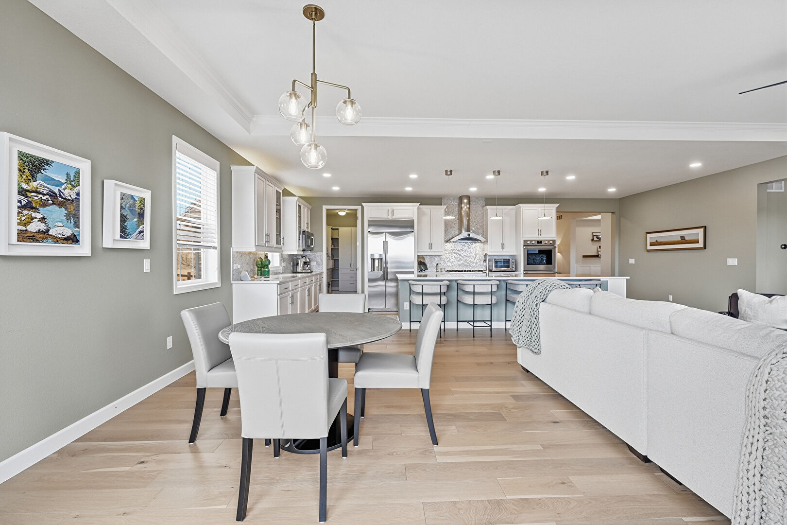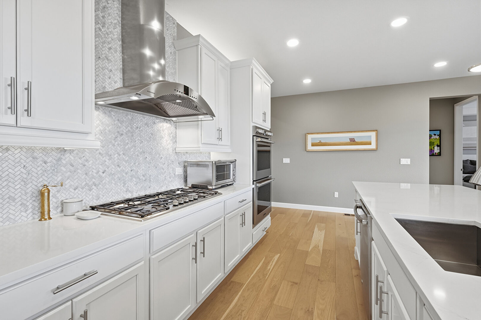 Baseboards Wall, Double Oven, Drywall, L Shaped Kitchen, Natural Light, Notable Chandelier, Recessed Lighting, Tray Ceiling, Vent, Wood Finish Floor, Notable Chandelier, Wood Finish Floor