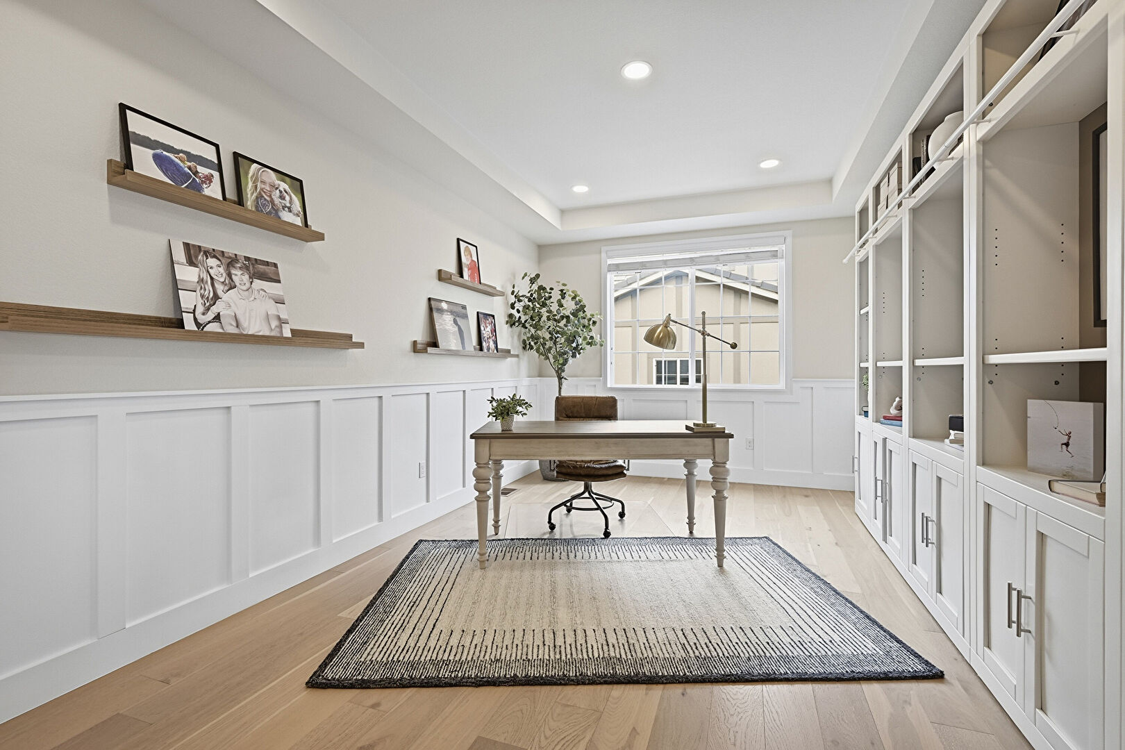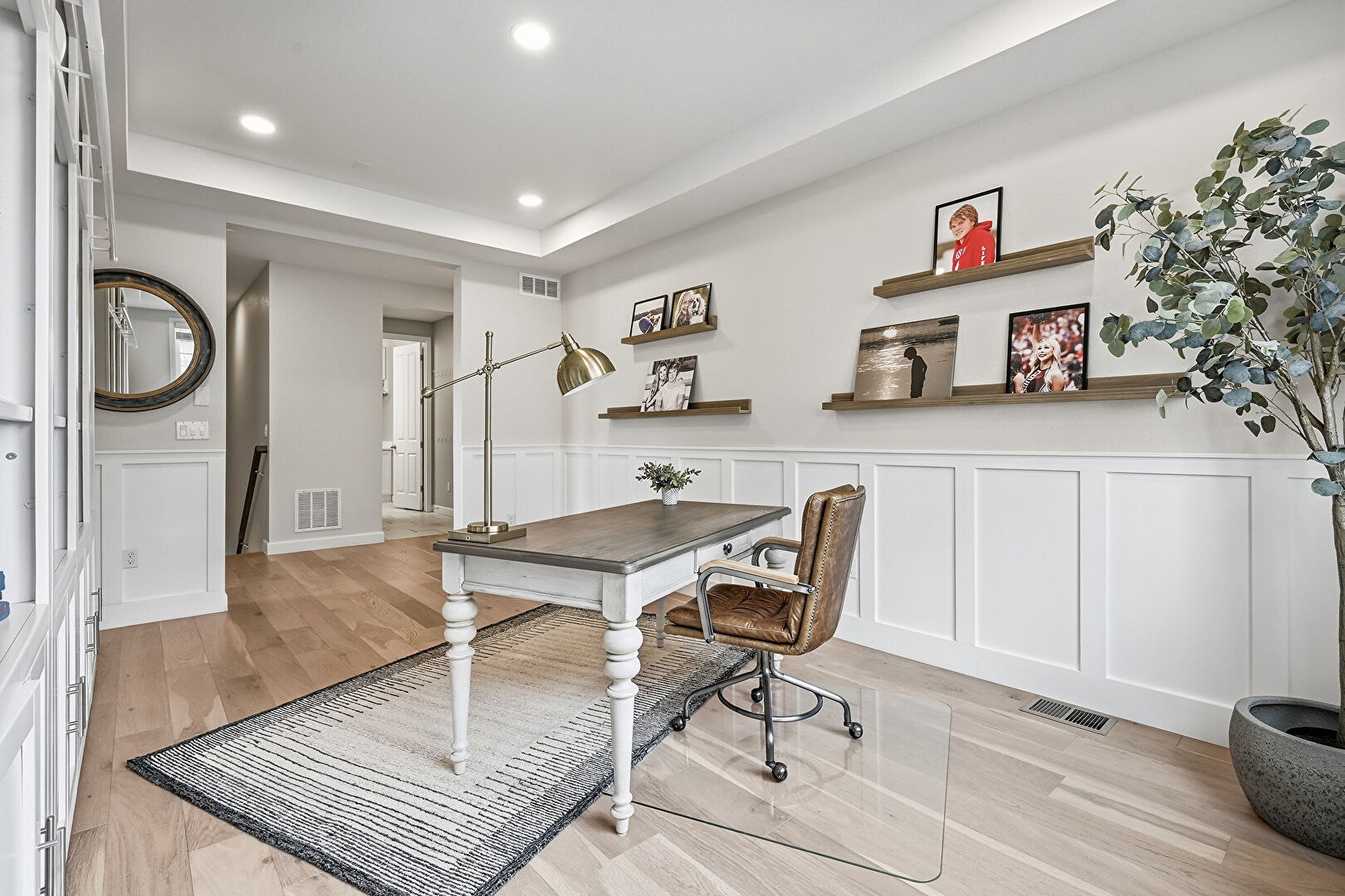Drywall, Natural Light, Office Area, Paneling Wall, Recessed Lighting, Tray Ceiling, Vent, Wainscot Wall, Wood Finish Floor, Drywall, Tray Ceiling