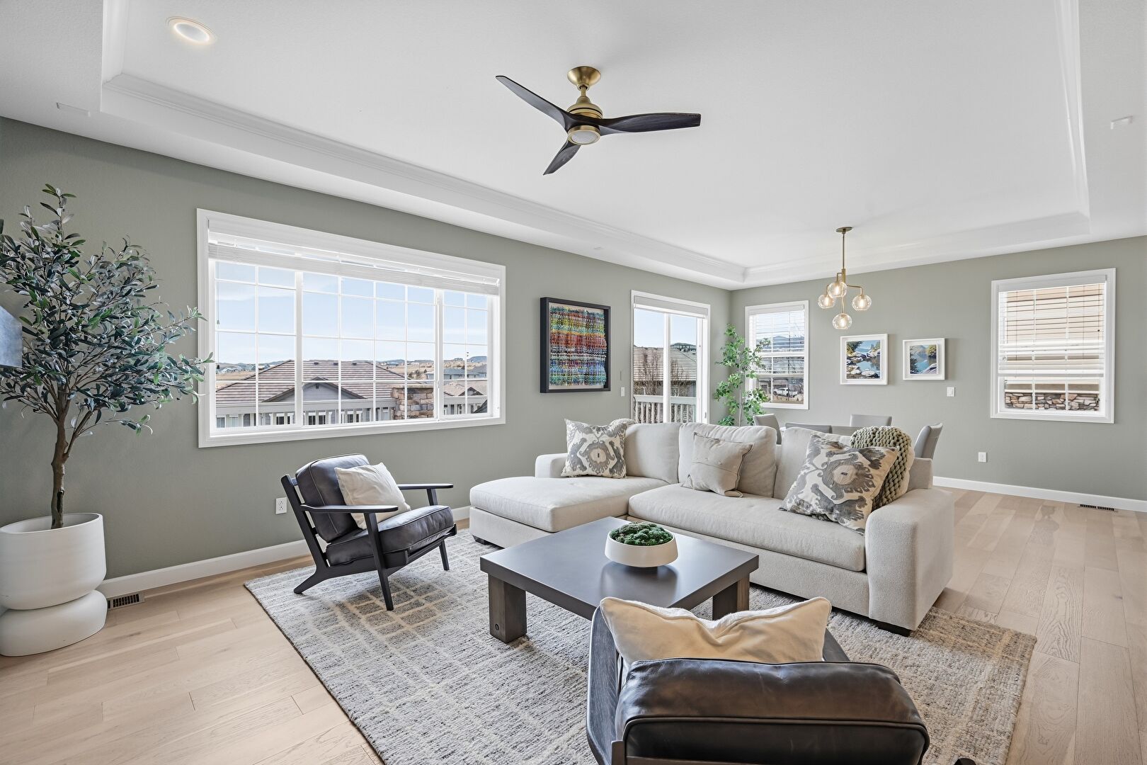 Baseboards Wall, Ceiling Fan, Crown Molding, Double Oven, Drywall, Fireplace, Natural Light, Recessed Lighting, Tray Ceiling, Vent, Wood Finish Floor, Ceiling Fan, Recessed Lighting