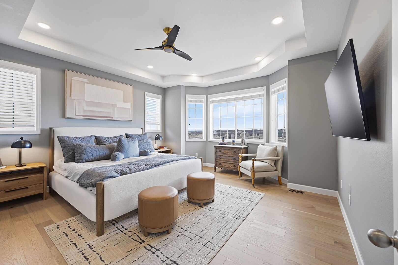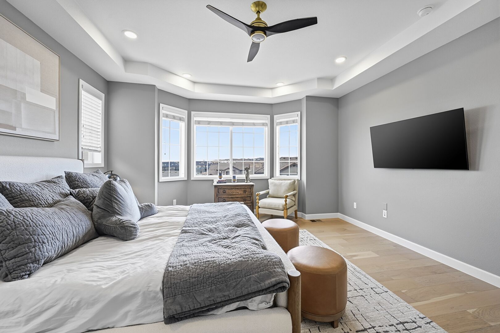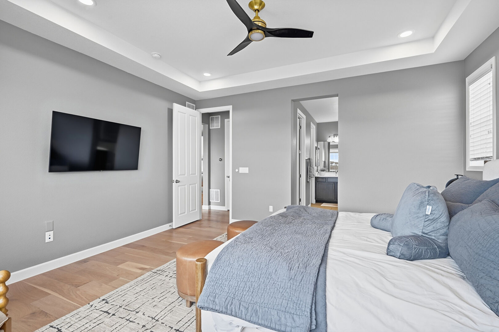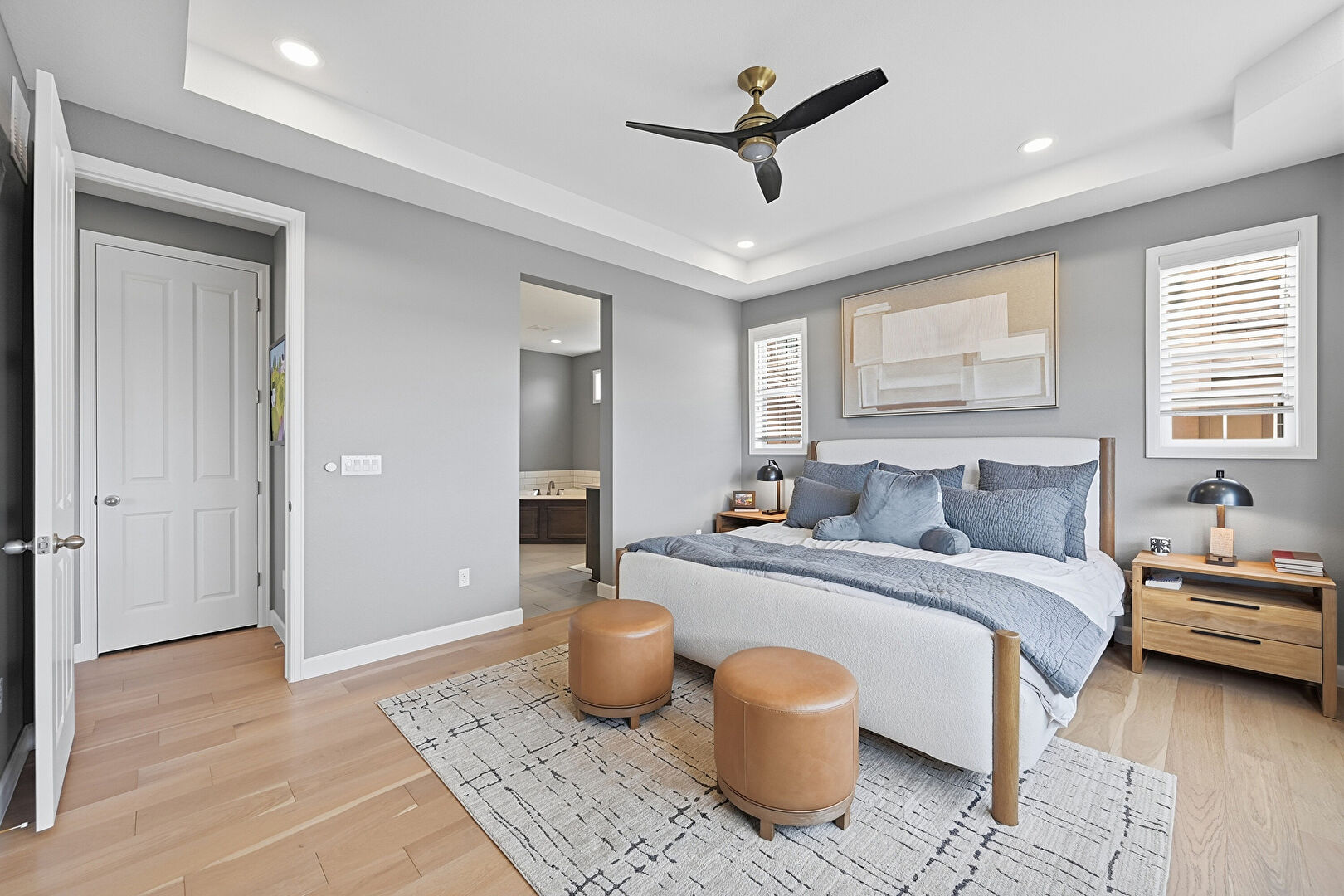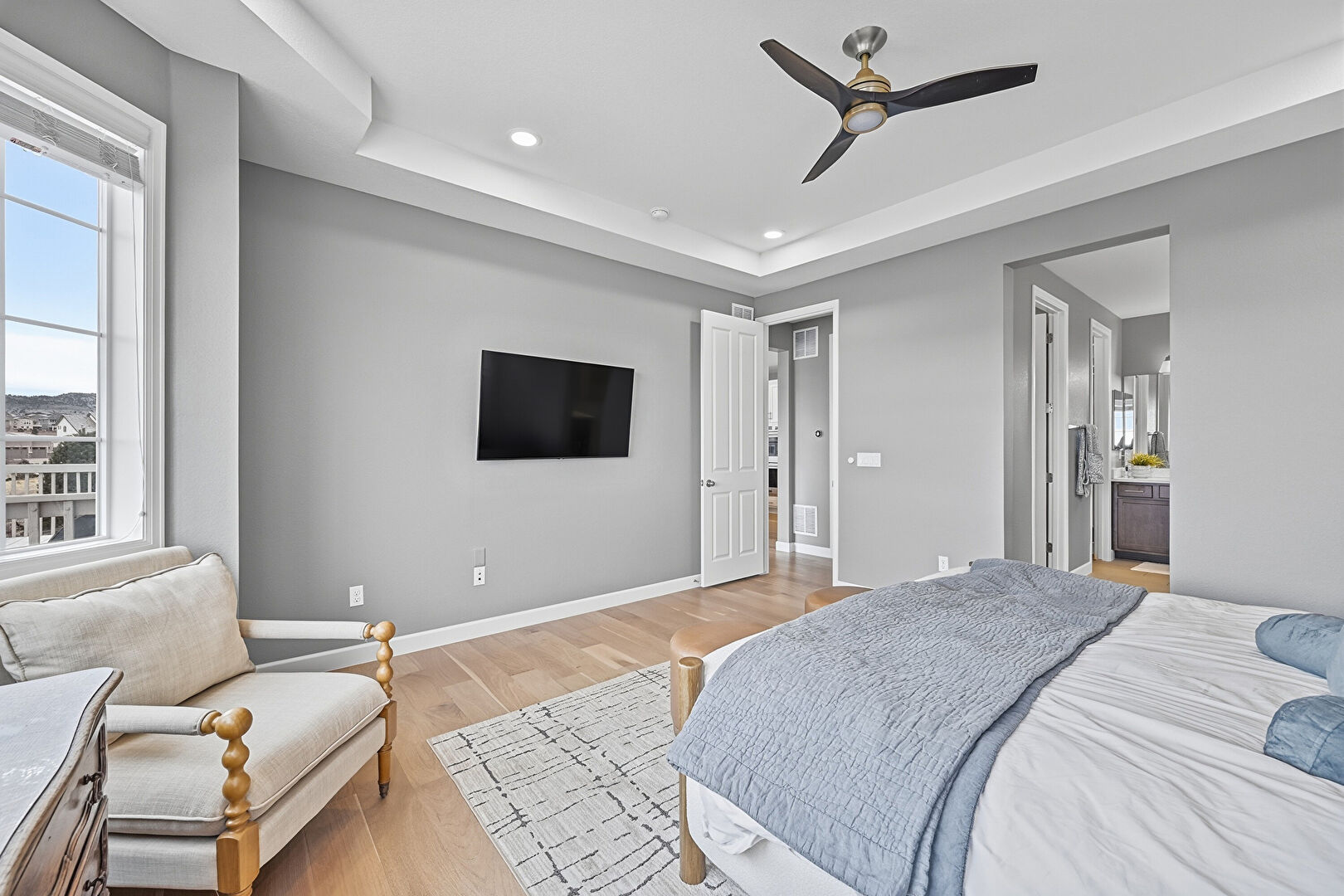Baseboards Wall, Ceiling Fan, Drywall, Ensuite Bathroom, Natural Light, Recessed Lighting, Tray Ceiling, Vent, Wood Finish Floor, Baseboards Wall, Ensuite Bathroom, Natural Light, Recessed Lighting, Wood Finish Floor