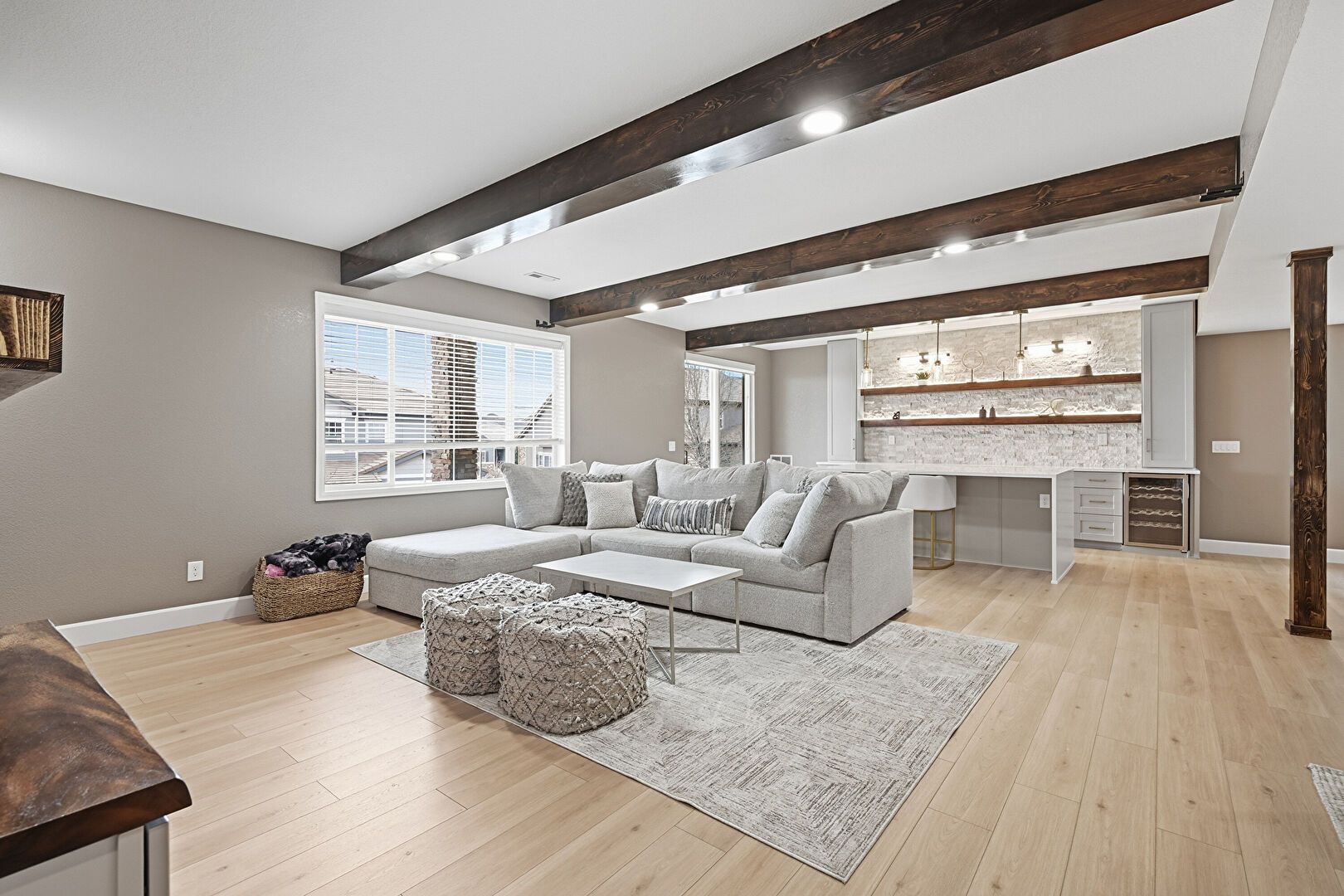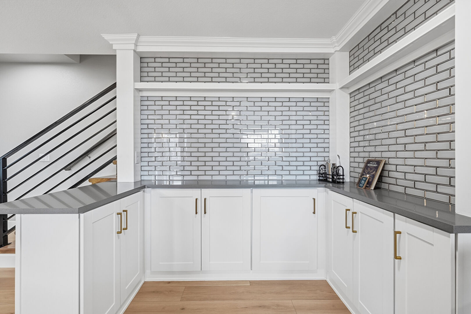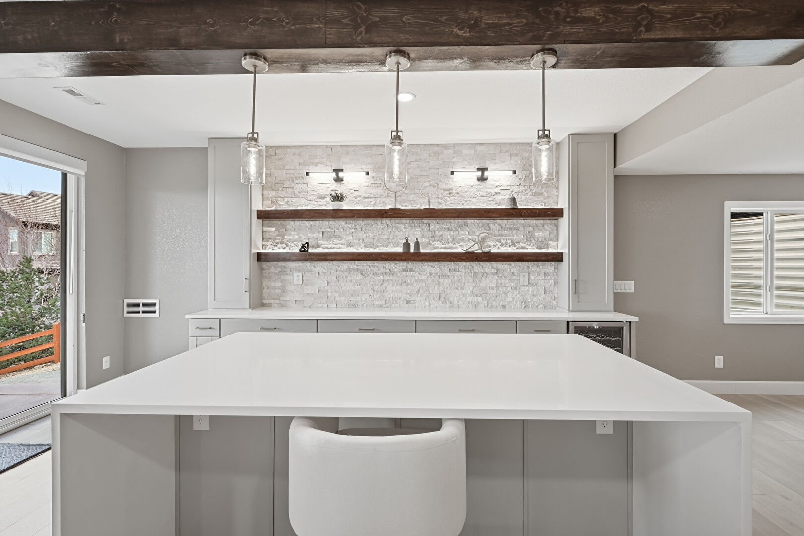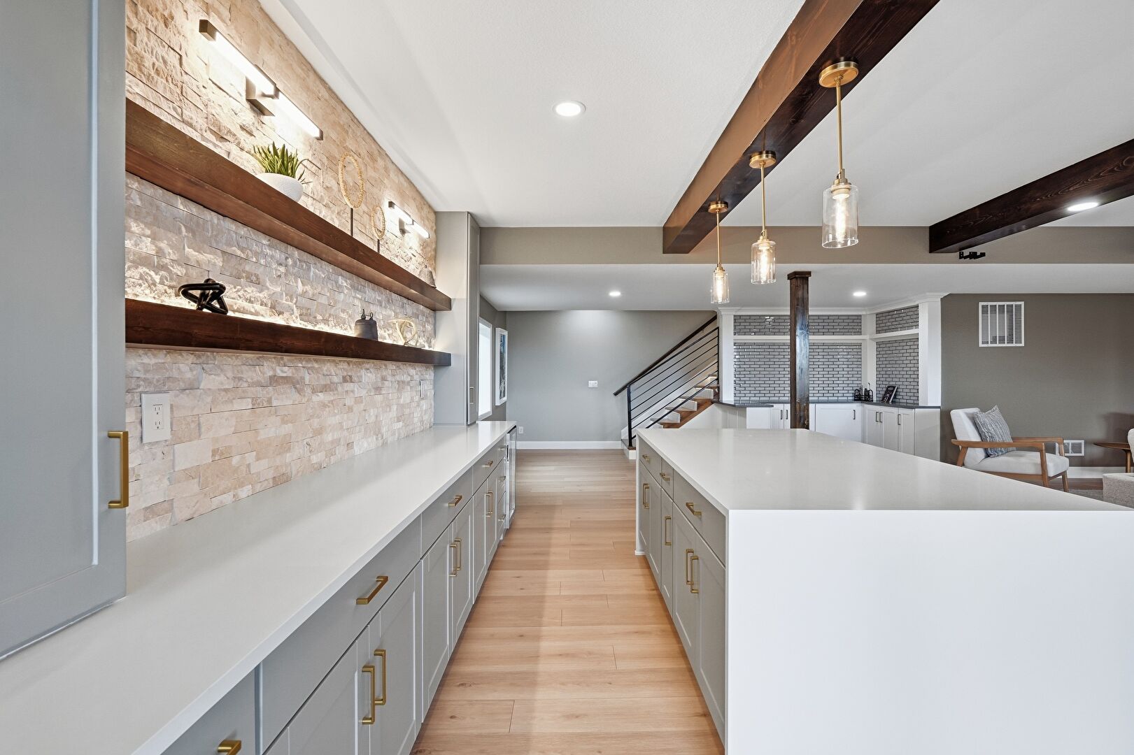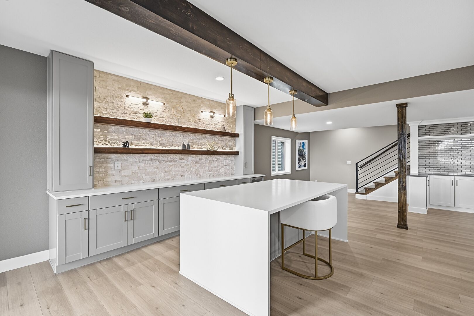 Baseboards Wall, Beamed Ceiling, Crown Molding, Drywall, Gray Cabinets, Indoor Bar, Kitchen Bar, Kitchen Island, Kitchen Peninsula, Natural Light, Open Shelves, Opens To Living Area, Pendant Lighting, Recessed Lighting, Shaker Cabinets, Stairs, Stone Countertops, Vent, Wood Finish Floor, Beamed Ceiling, Open Shelves, Shaker Cabinets, Wine Cooler