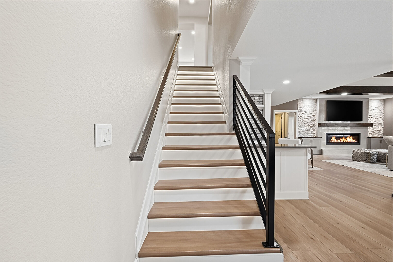 Fireplace, Recessed Lighting, Textured Wall, Wood Finish Floor, Stairs